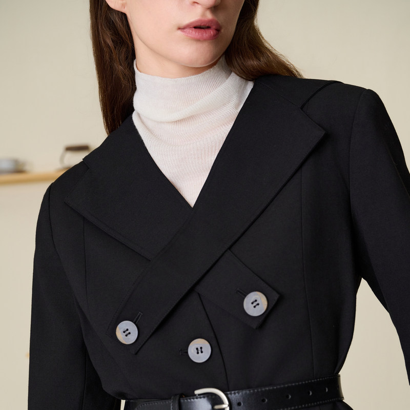 扣袢样式领;本布腰带设计;H版型包容性强