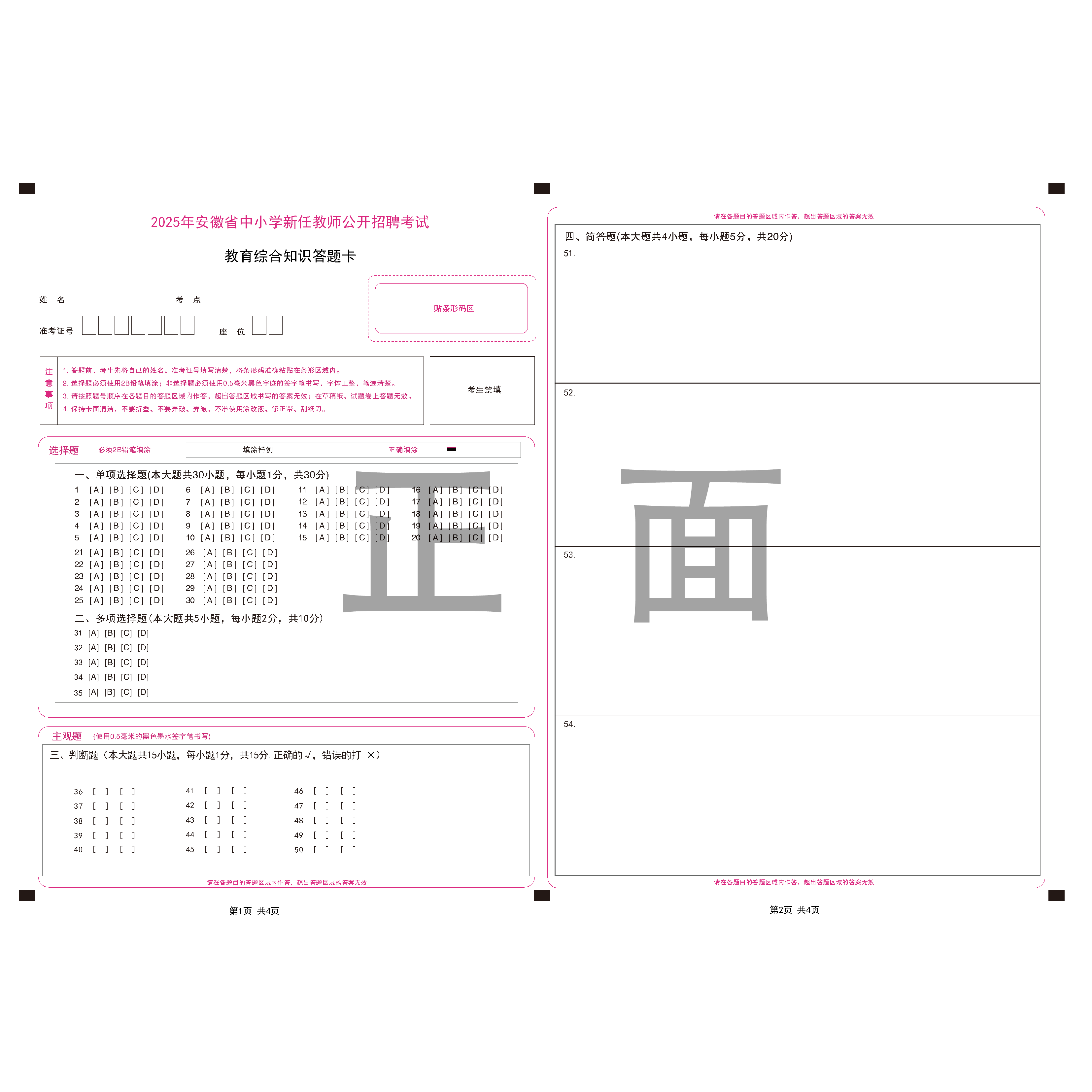 2025年安徽省教师招聘考试教招教育综合知识答题卡模拟考试专用A3双面媲美考试纸张支持定制各类答题卡