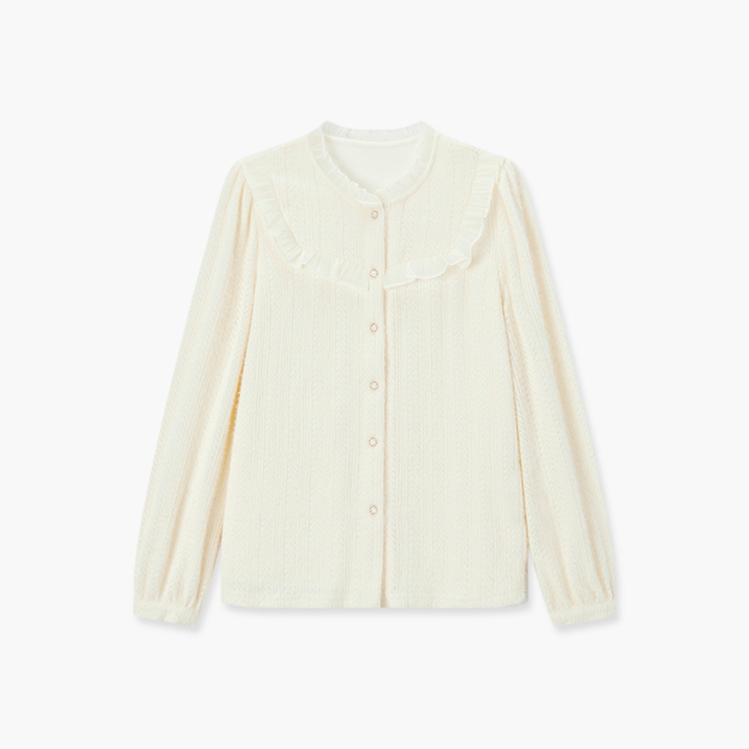 COCOBELLA名媛风手工压褶木耳边雪纺衬衫气质通勤飘带衬衣SR7062
