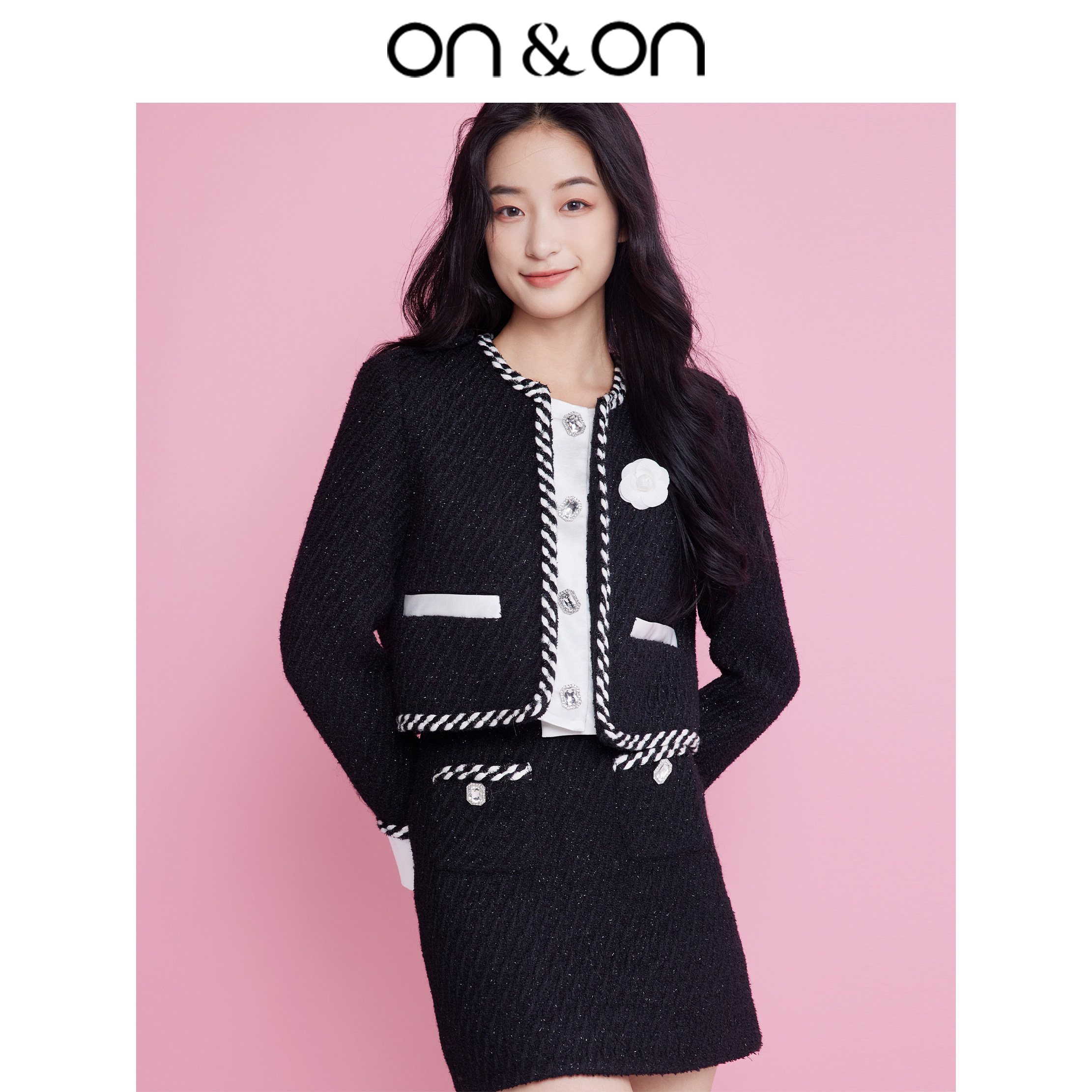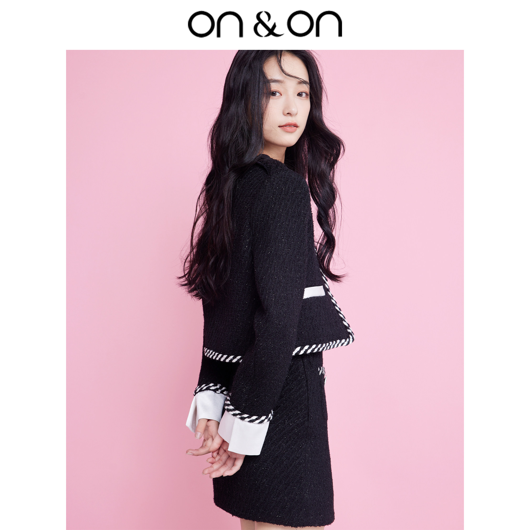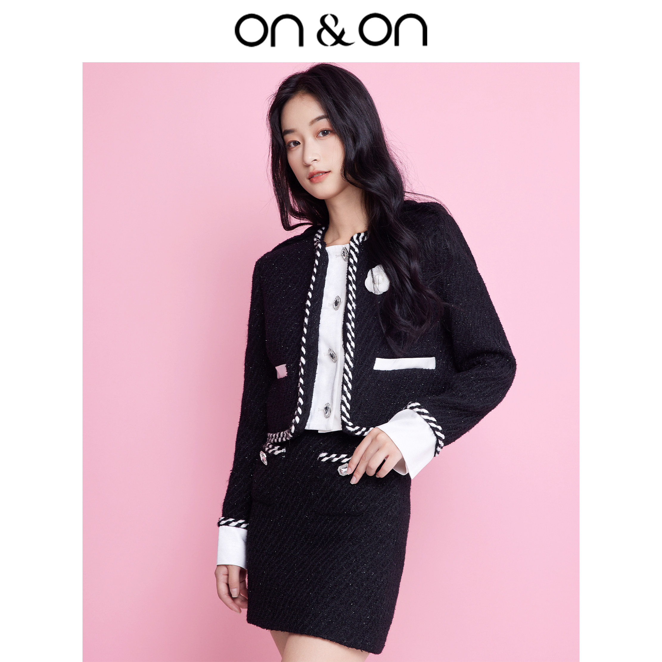 ON&ON/安乃安26春季黑色撞色编制小香风假两件短款羊毛时尚套装