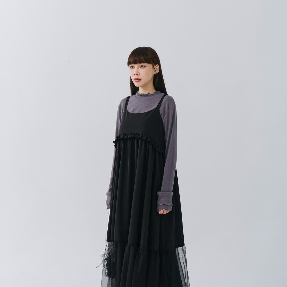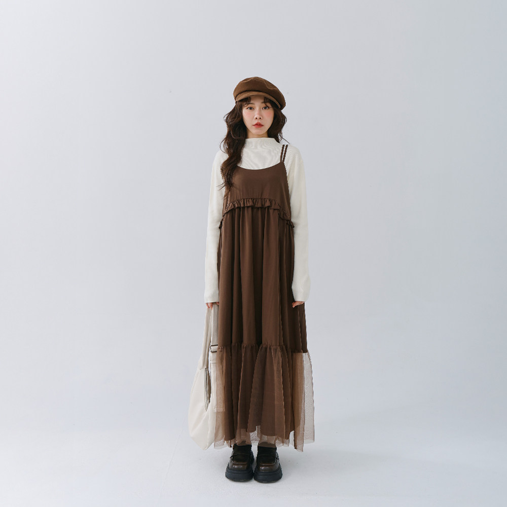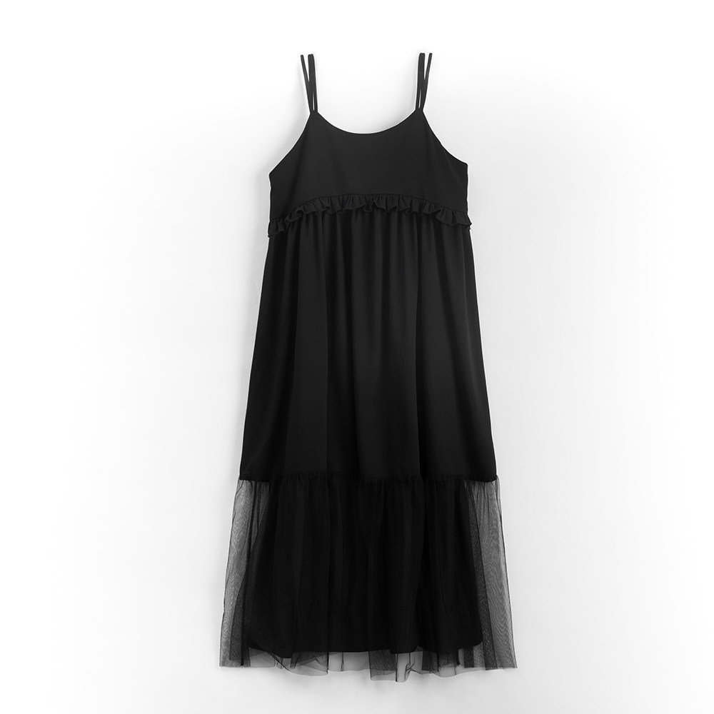 QUEENSHOP 2025秋冬新品女装荷叶透纱拼接绑带细肩连衣裙01087239