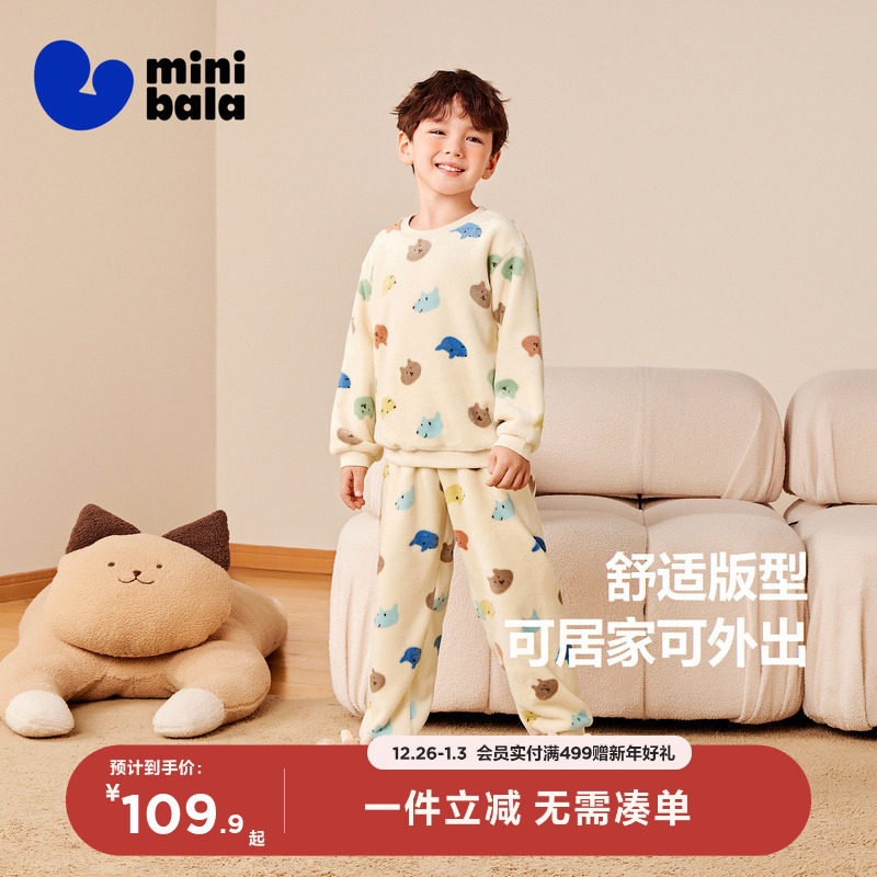 迷你巴拉巴拉男童女童保暖睡衣冬季儿童保暖双面绒家居服睡衣套装