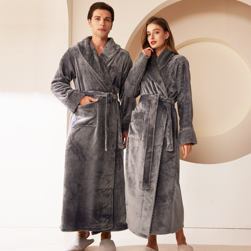 网红同款秋冬睡袍男过膝简约系带浴袍女加绒保暖洗澡珊瑚绒浴衣
