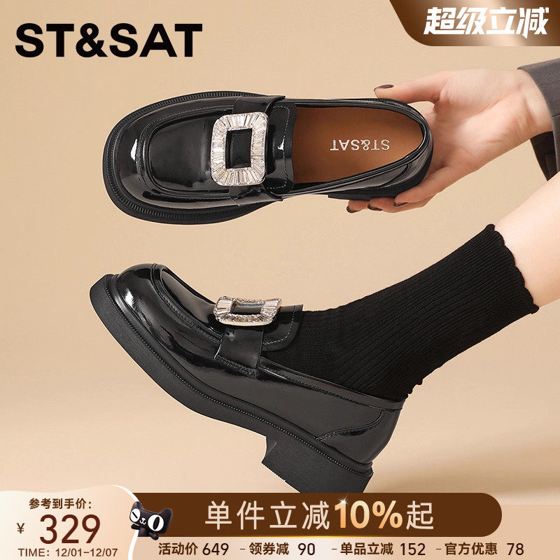 星期六厚底乐福鞋女新款秋冬季英伦风小皮鞋女一脚蹬水钻方扣单鞋
