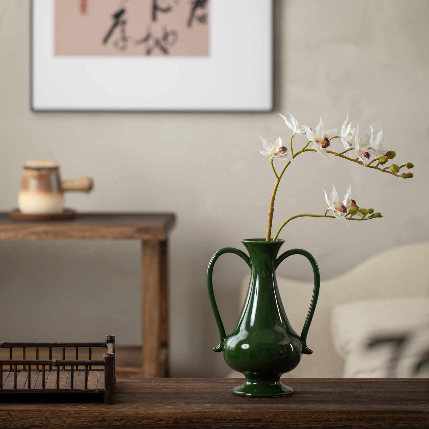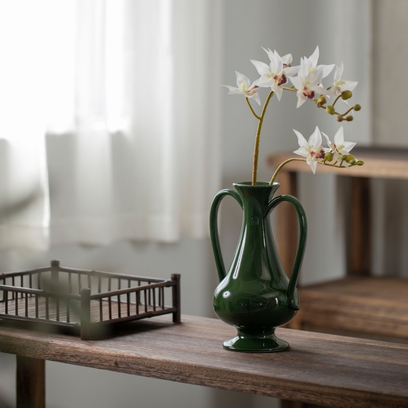 景德镇现代简约陶瓷花瓶置物架绿色双耳插花器皿民宿酒店台面摆件