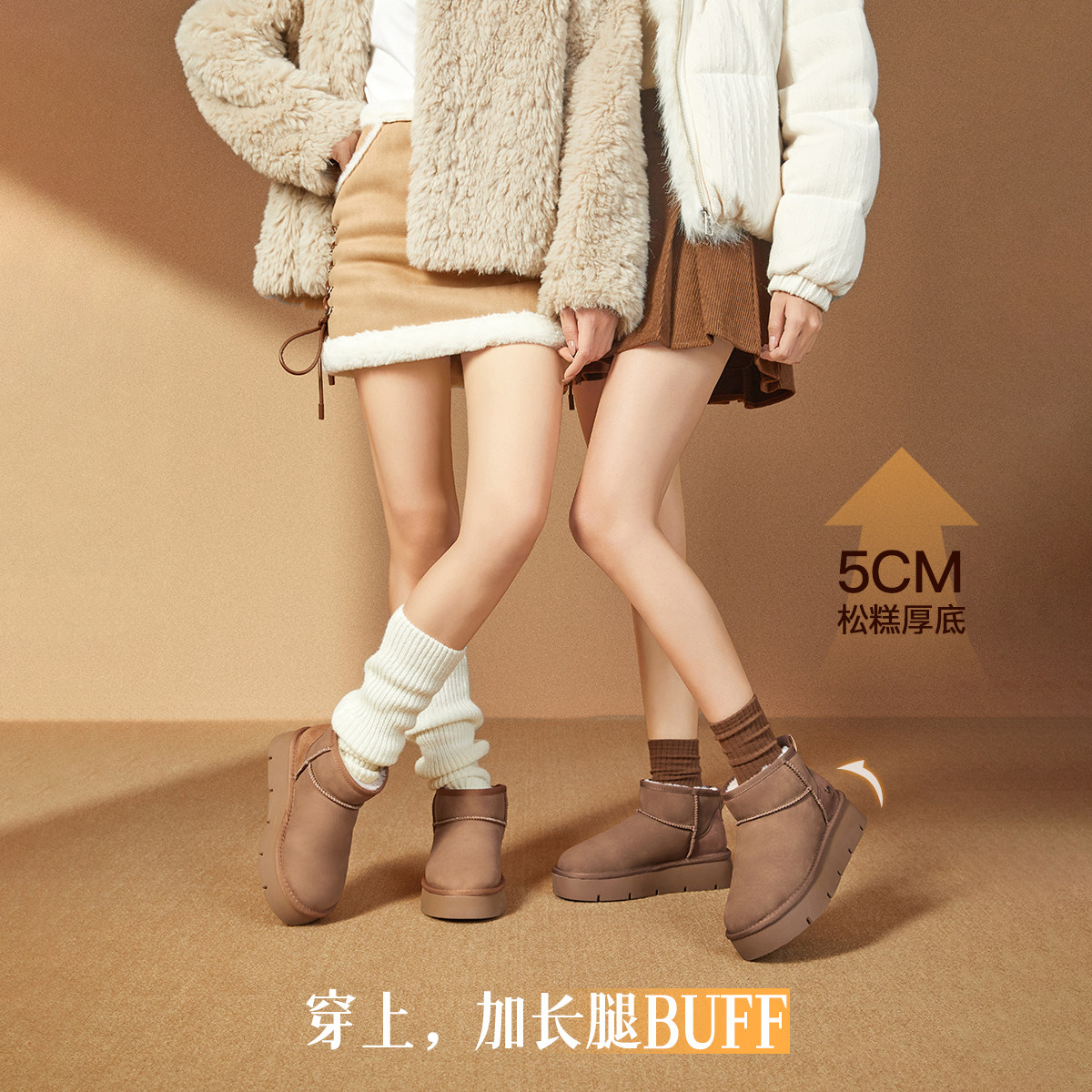 内增高~桑坡真皮厚底羊毛雪地靴女加绒保暖东北棉靴秋冬季短筒靴