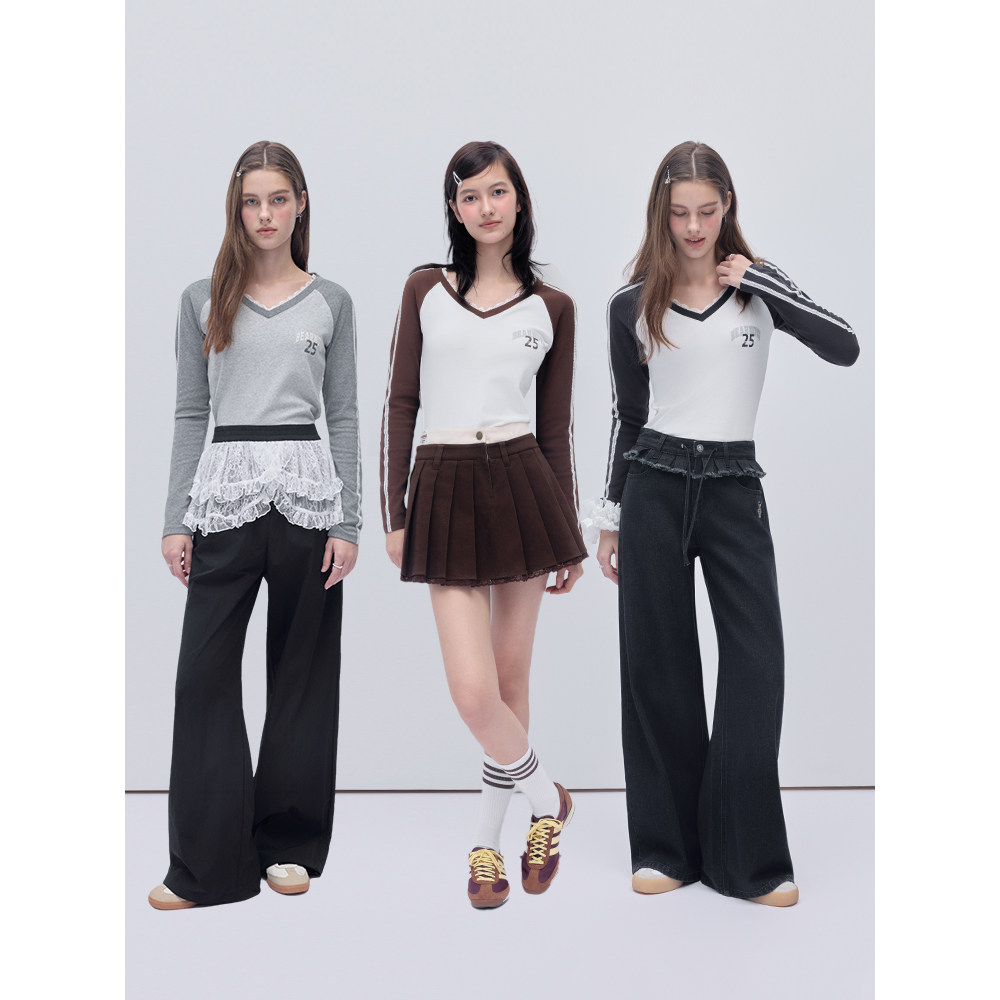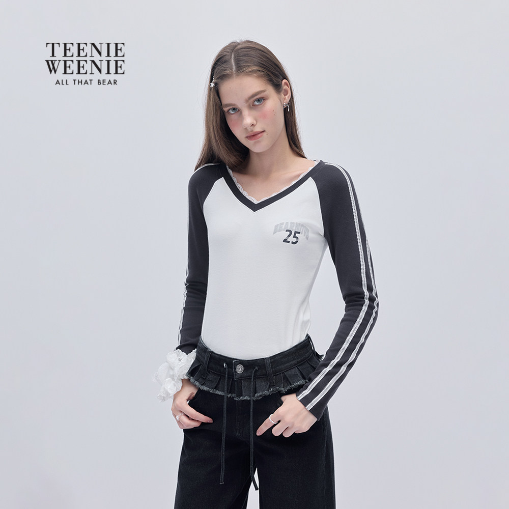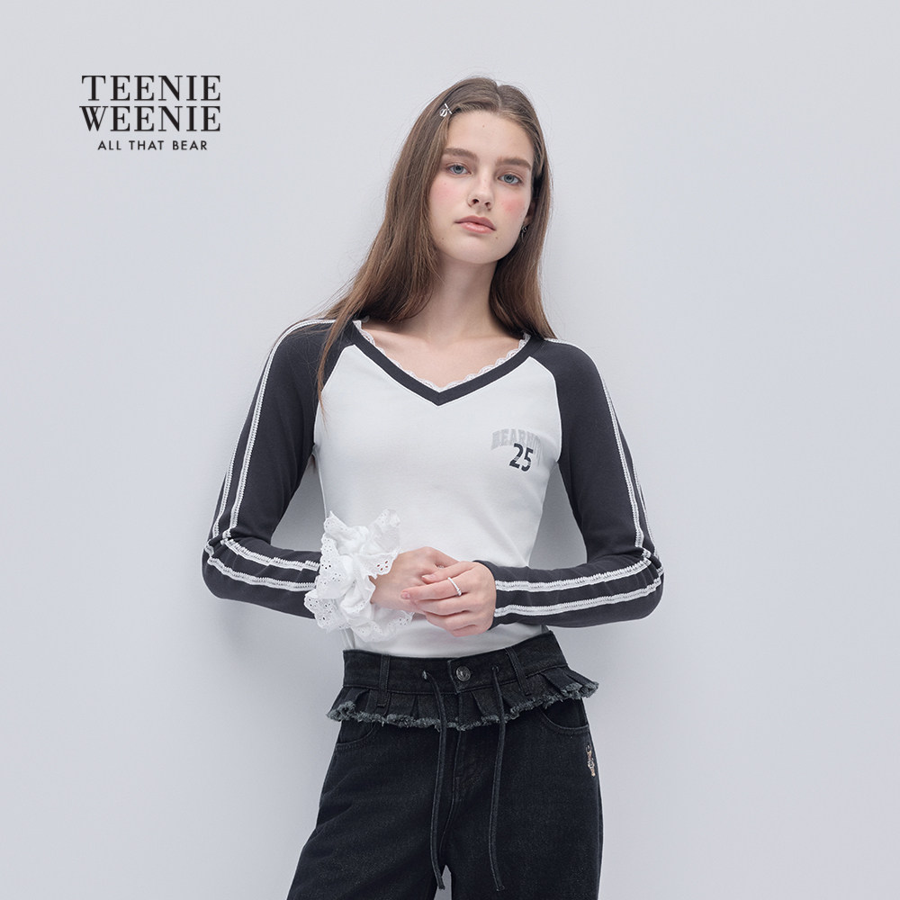 TEENIEWEENIE bearnova小熊女装蕾丝拼接撞色V领长袖T恤打底衫