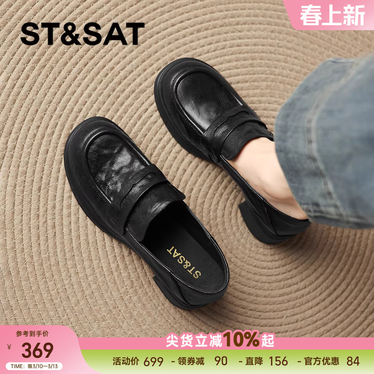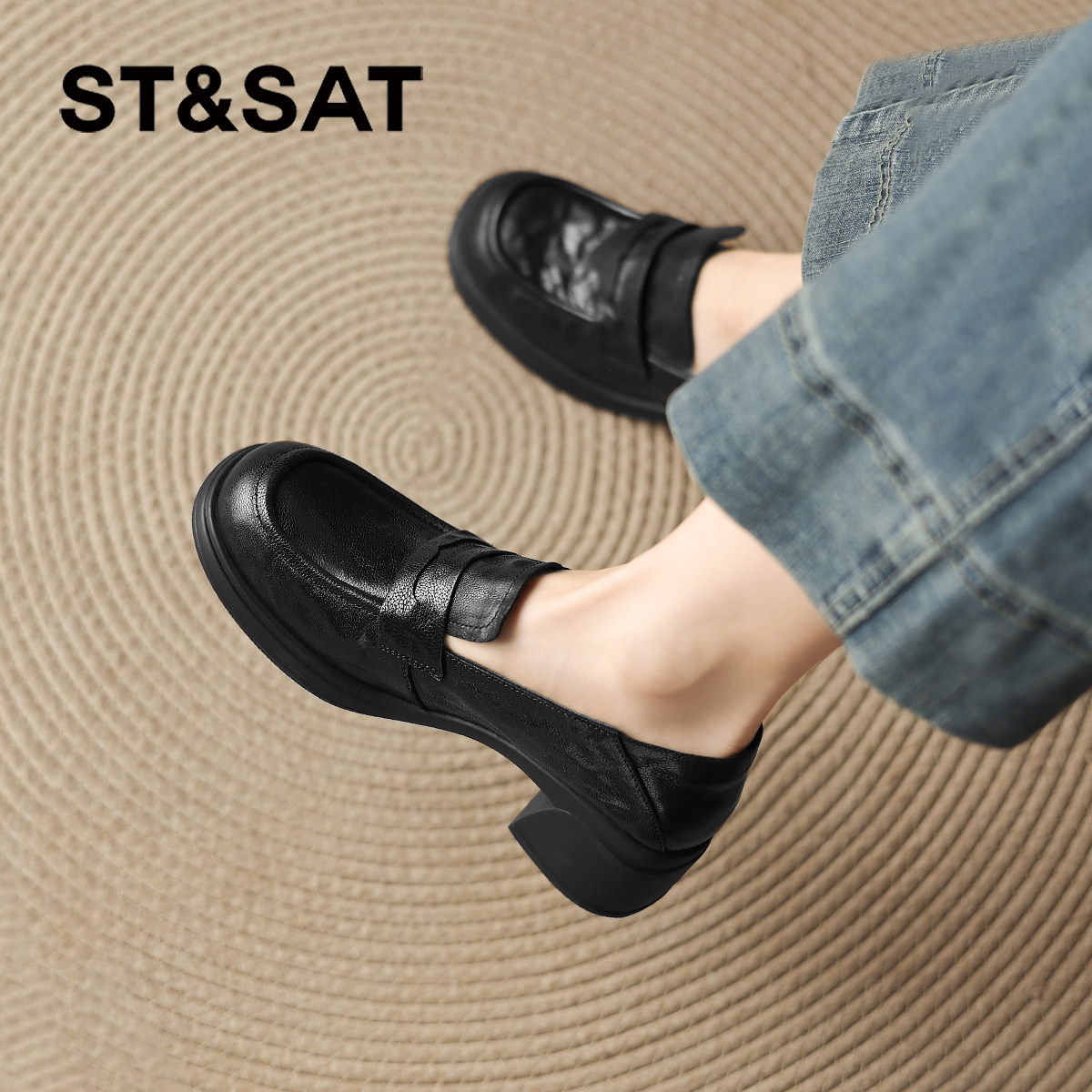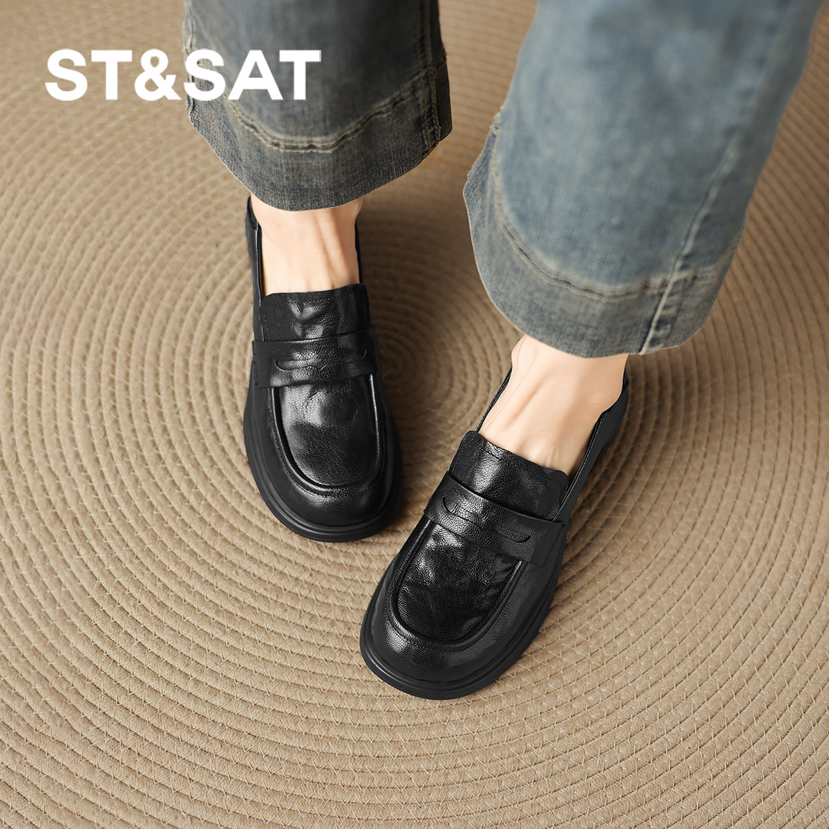 星期六羊皮乐福鞋女春季新款软底不累脚女鞋黑色通勤小皮鞋