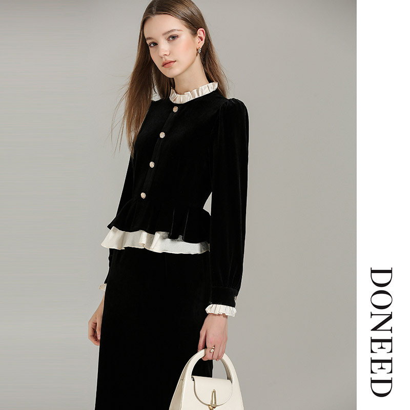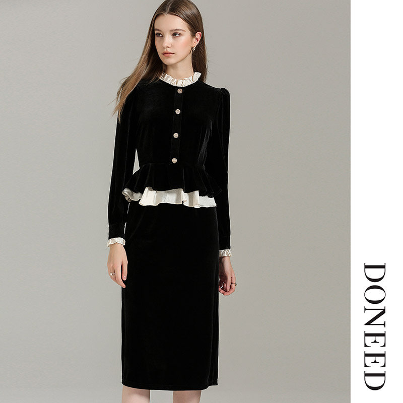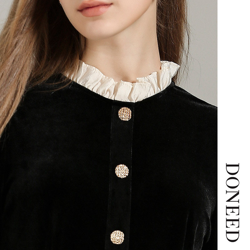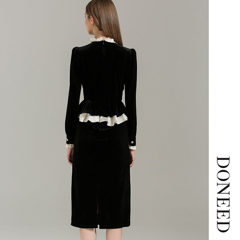 DONEED春款时尚通勤收腰气质优雅拼接设计感丝绒假两件连衣裙女