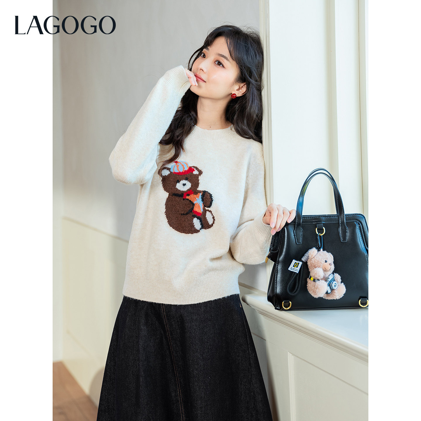 棉花糖小熊LAGOGO米色毛衣女拉谷谷2025冬款含羊毛落肩松弛针织衫