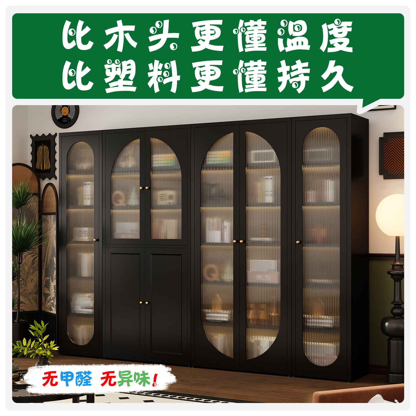 黑色2米高书柜长虹玻璃现代简约法式复古风书架客厅展示柜储物柜