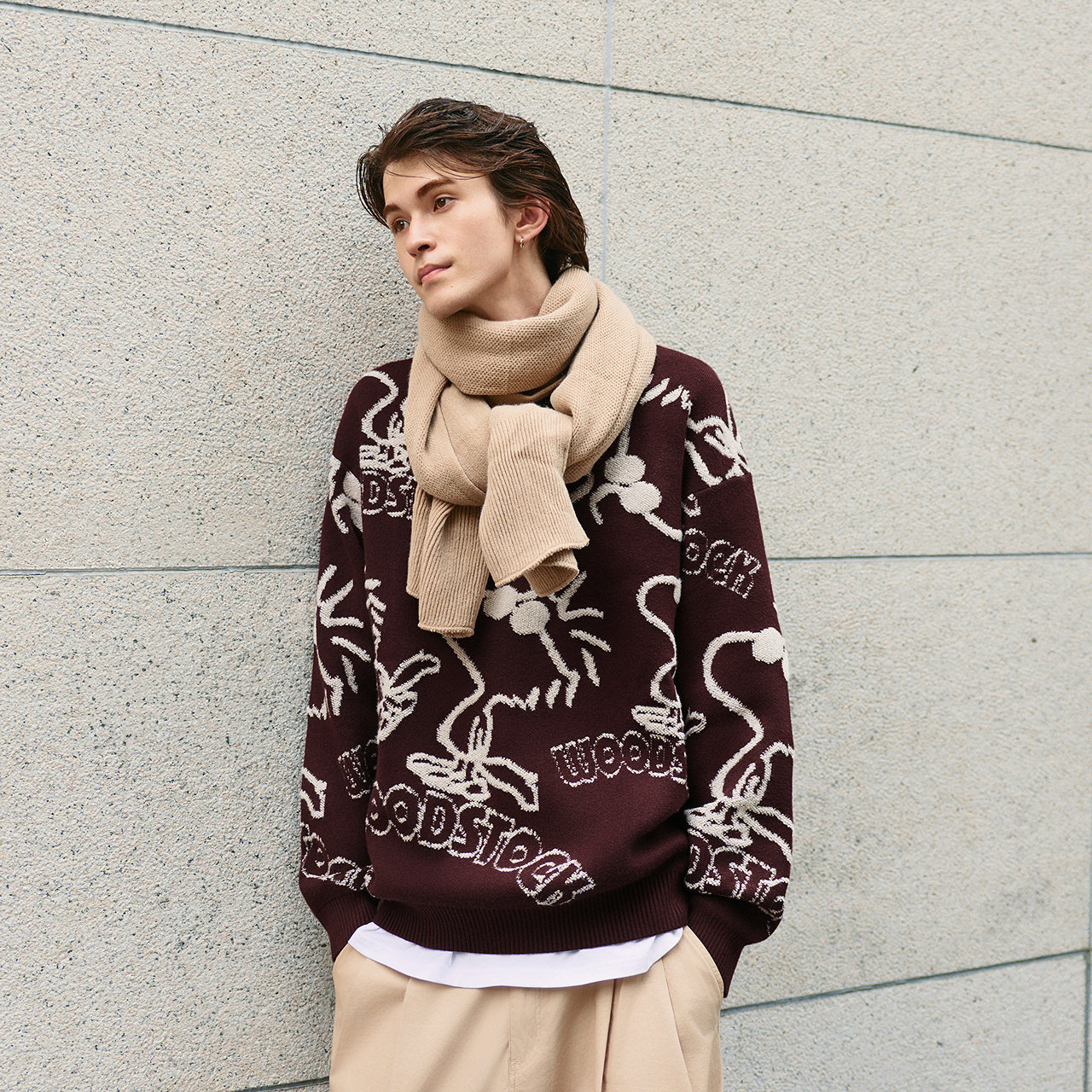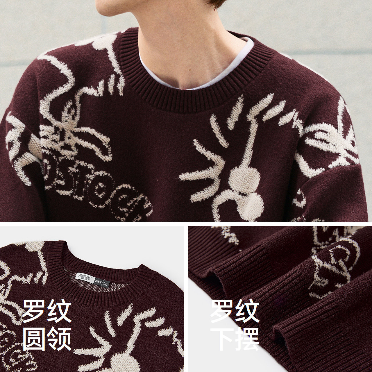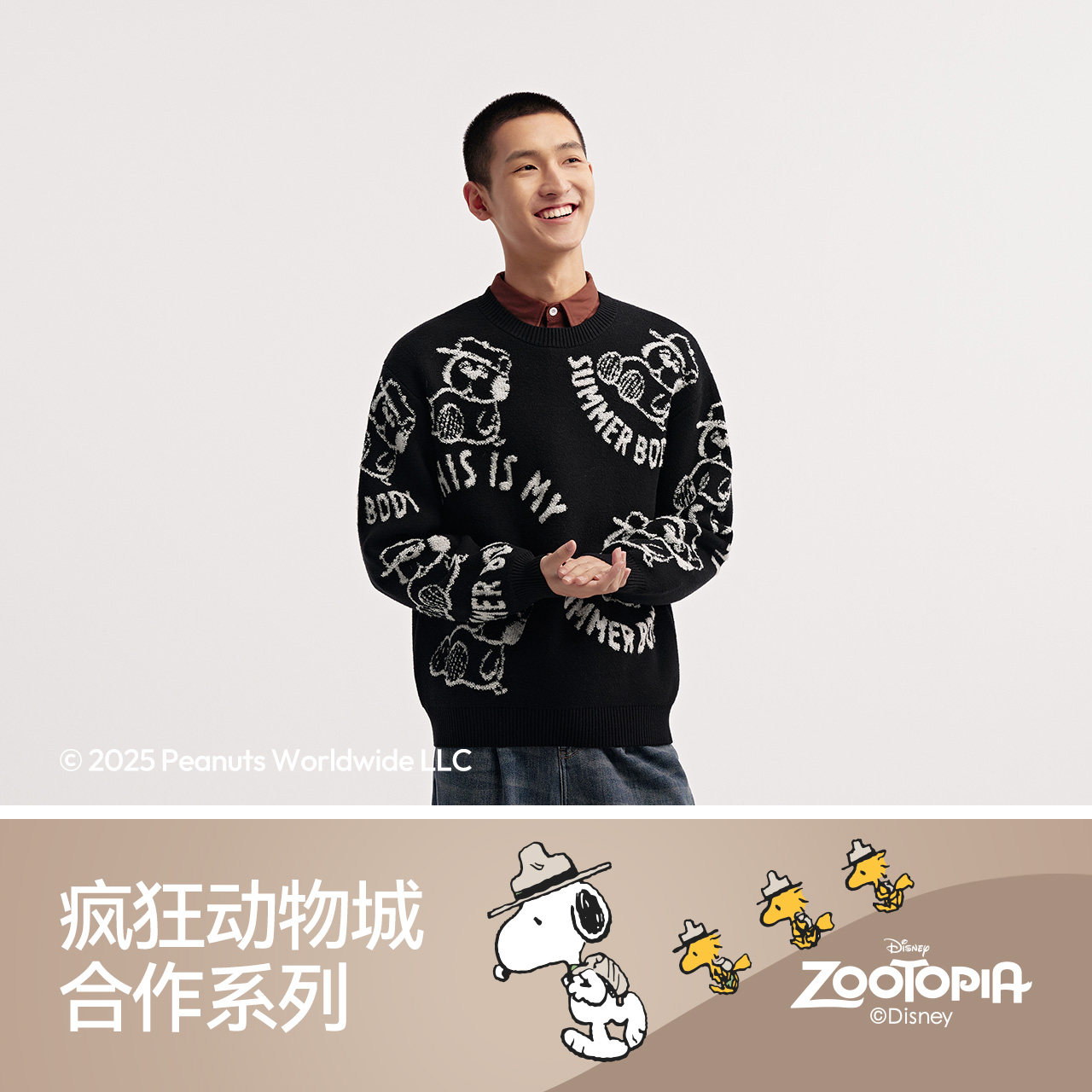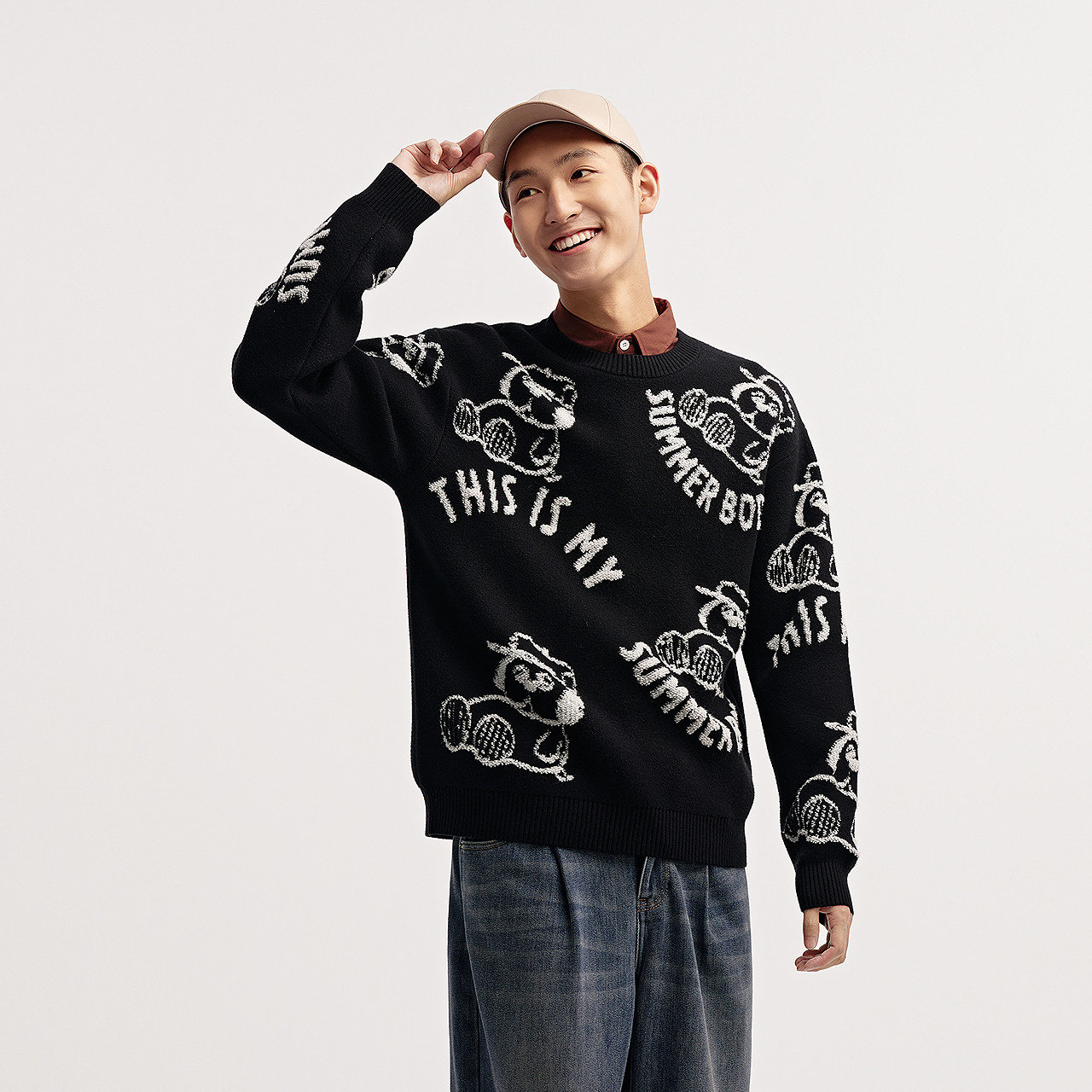 森马史努比系列毛衫男冬季满版提花针织衫撞色情侣毛衣宽松套头衫