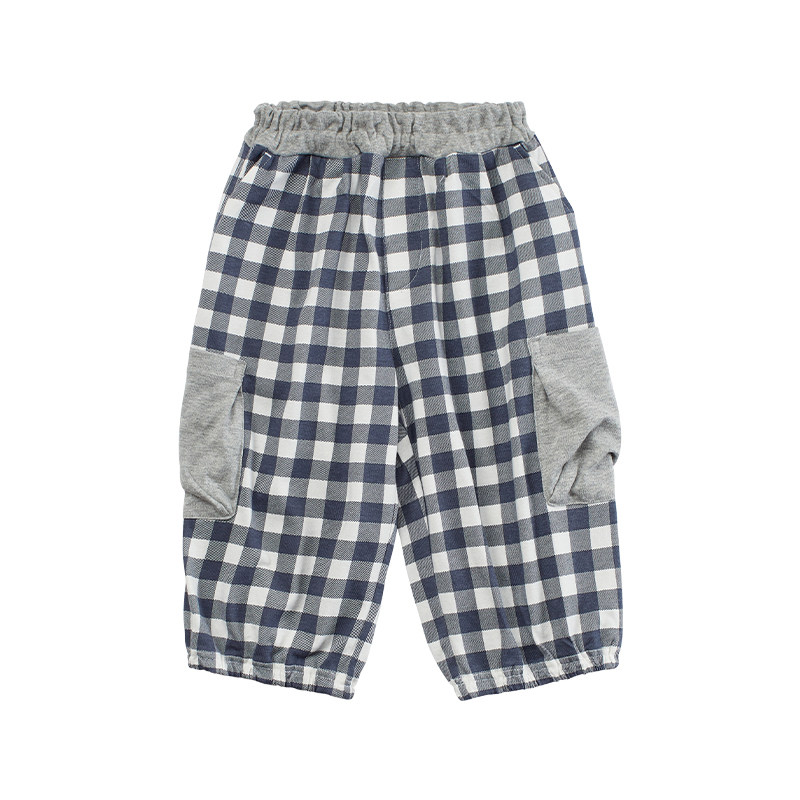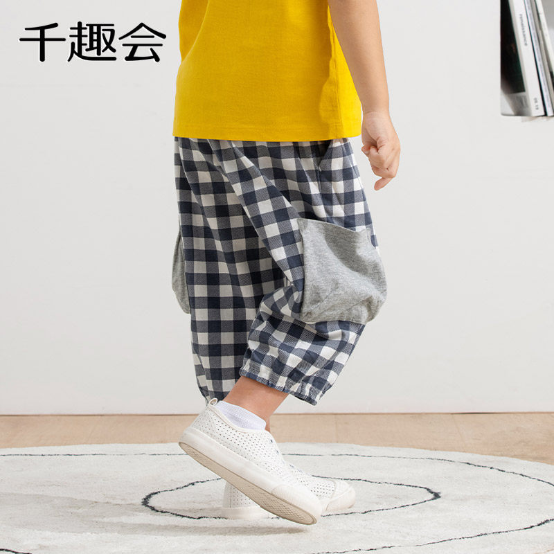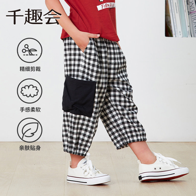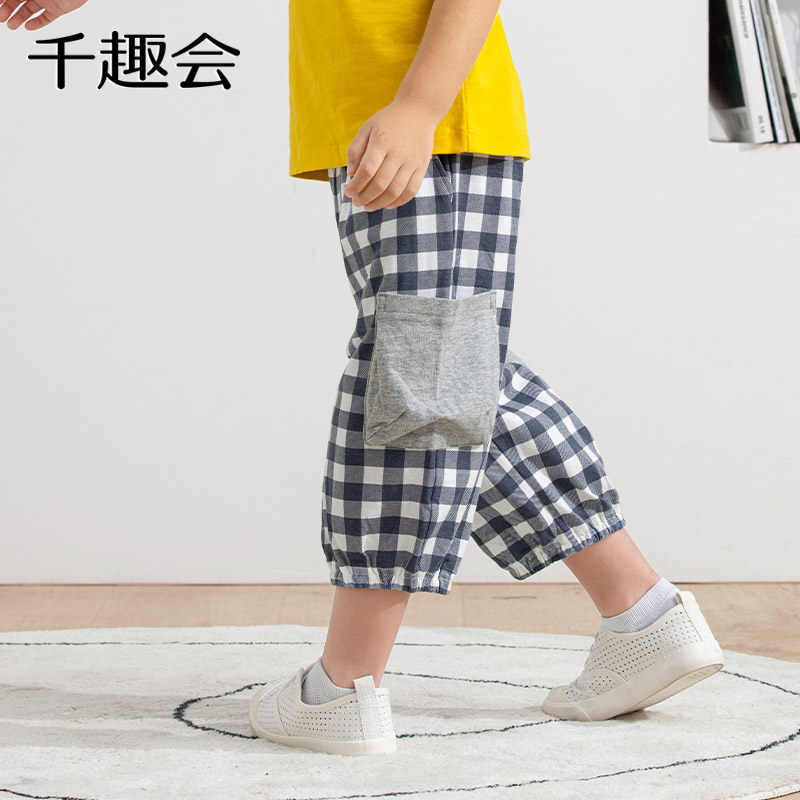 千趣会童装夏季男童时尚格纹工装口袋柔软透气棉质七分休闲裤