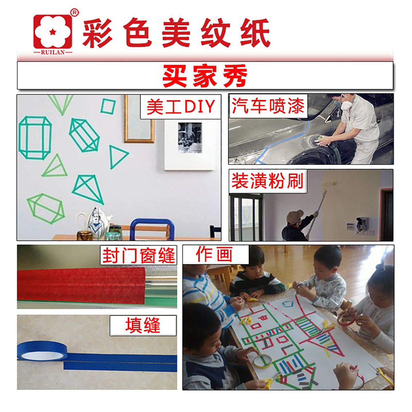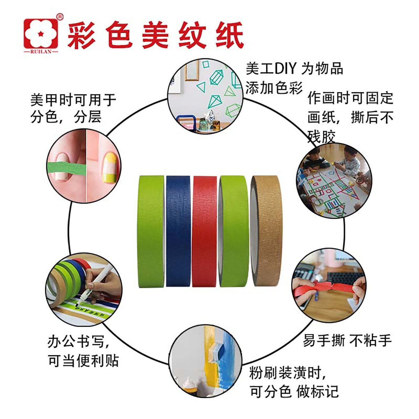 彩色美纹纸胶带绿红蓝棕色分色纸装饰diy手撕无痕易撕墙纸遮蔽纸
