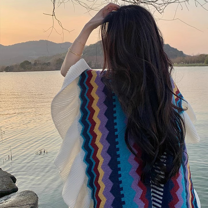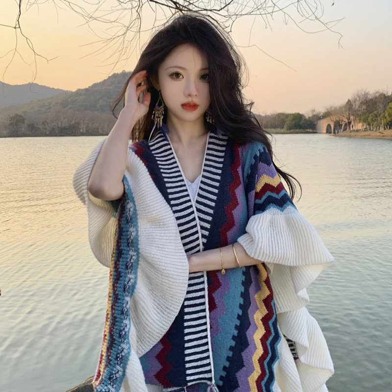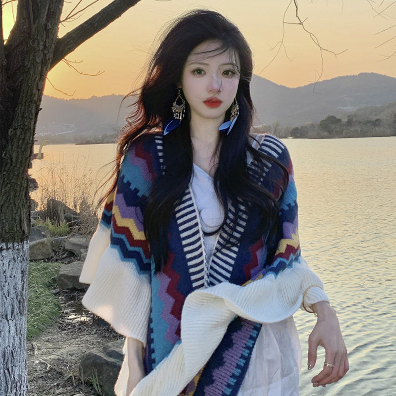 云南丽江民族风蓝色旅游披肩女外搭氛围感时尚披风斗篷针织围巾女