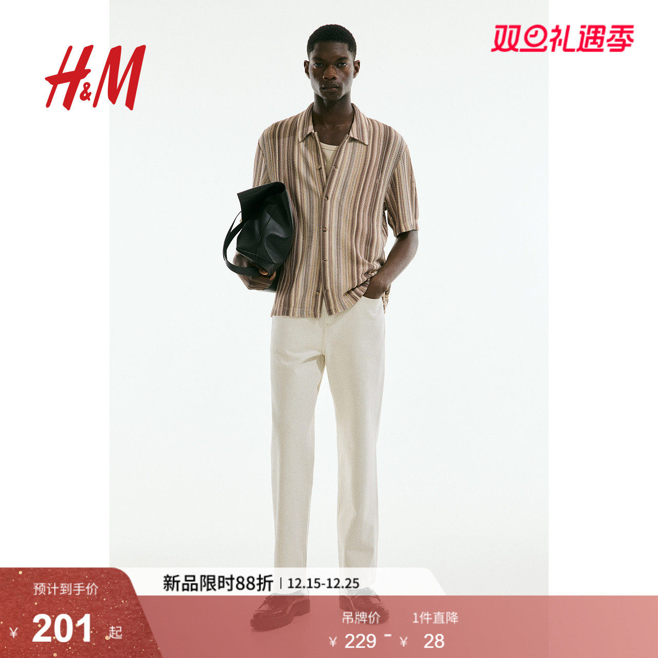 HM男装衬衫2025冬季新款时尚休闲标准版型仿钩编短袖衬衣1265118