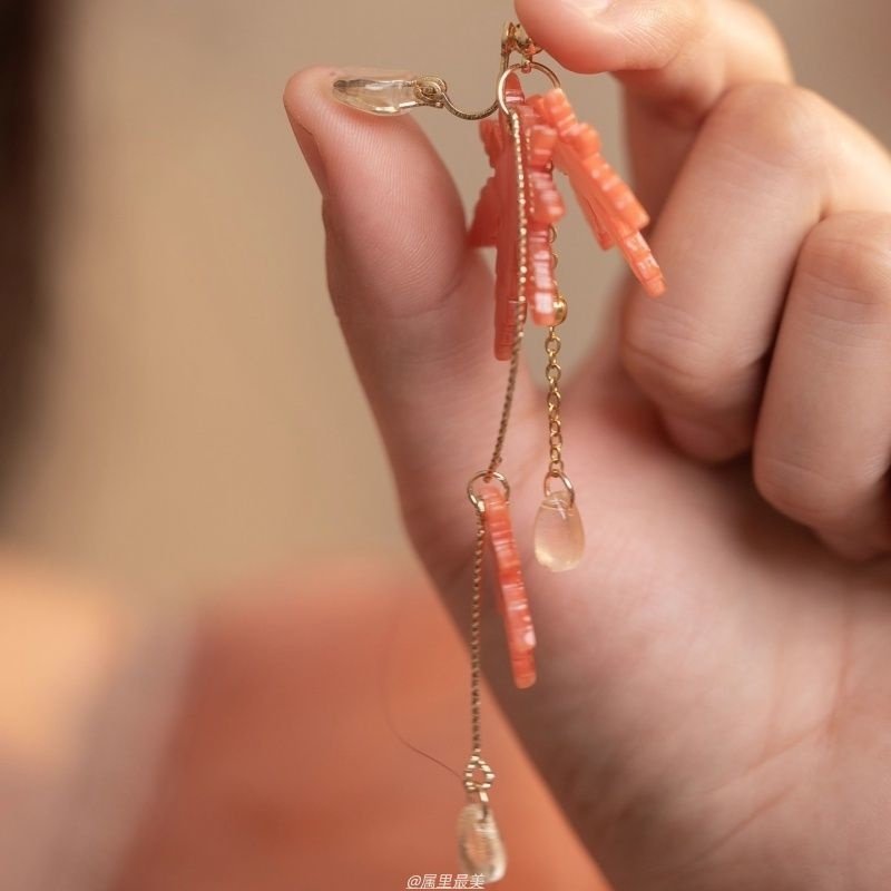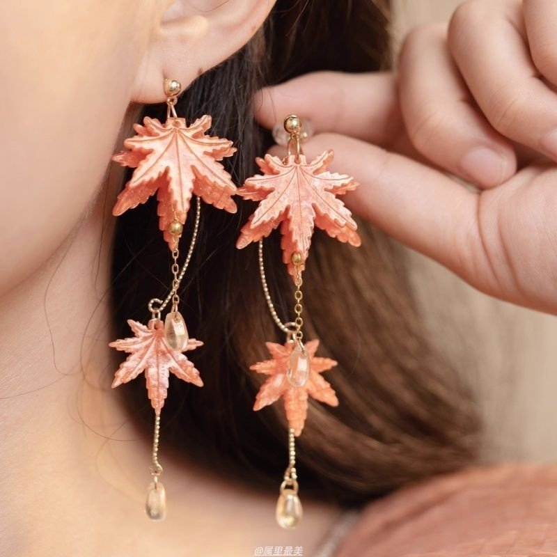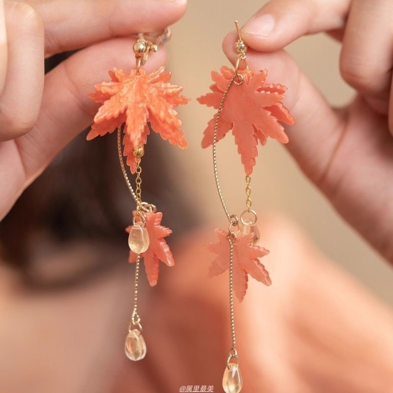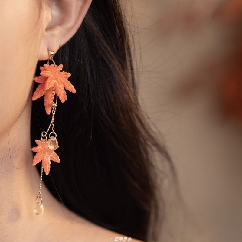 入秋红色枫叶流苏耳环复古优雅耳夹高级国风耳饰喜庆