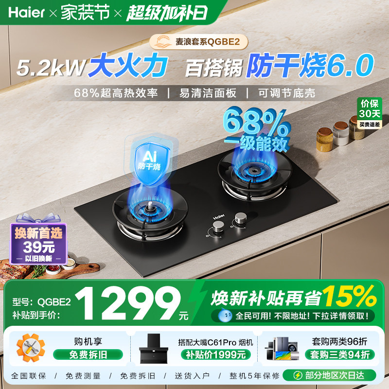 海尔麦浪天然气煤气灶家用厨房防干烧双灶台猛火燃气灶QGBE2