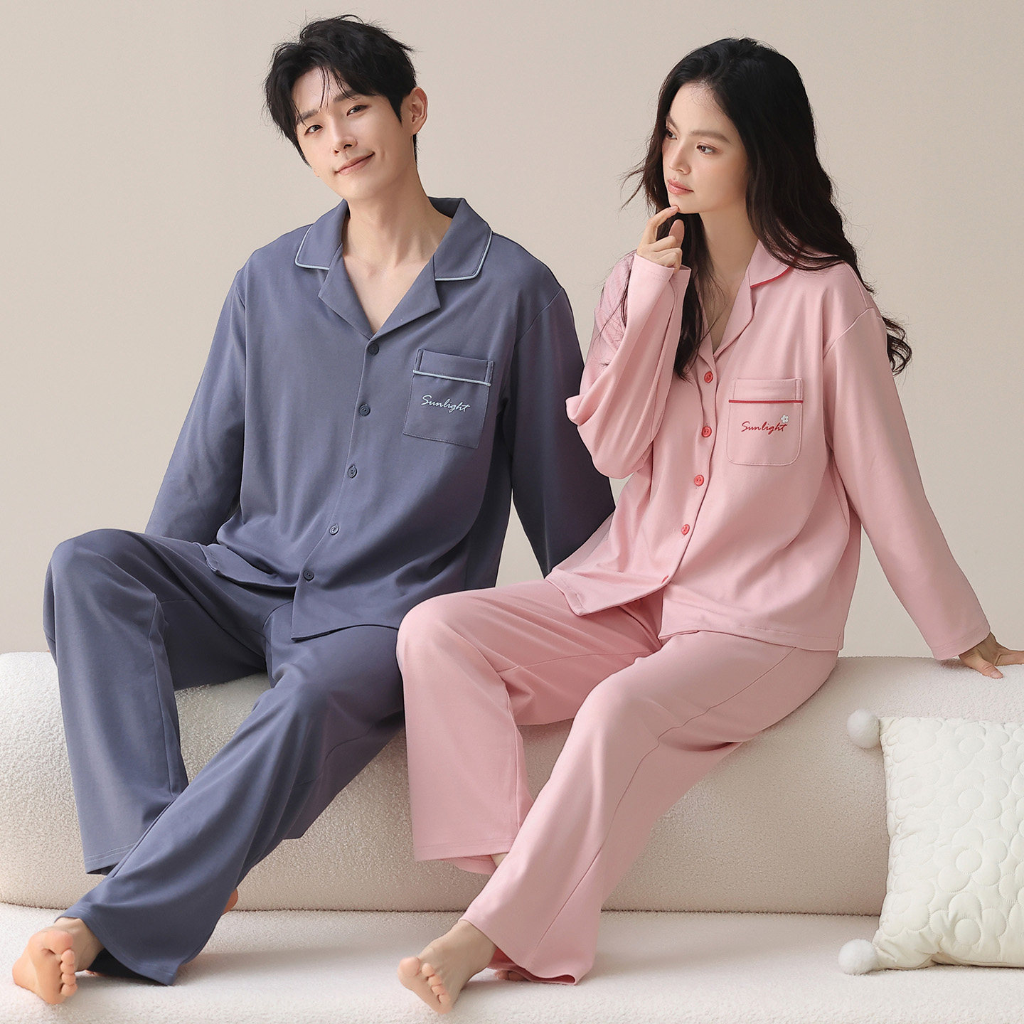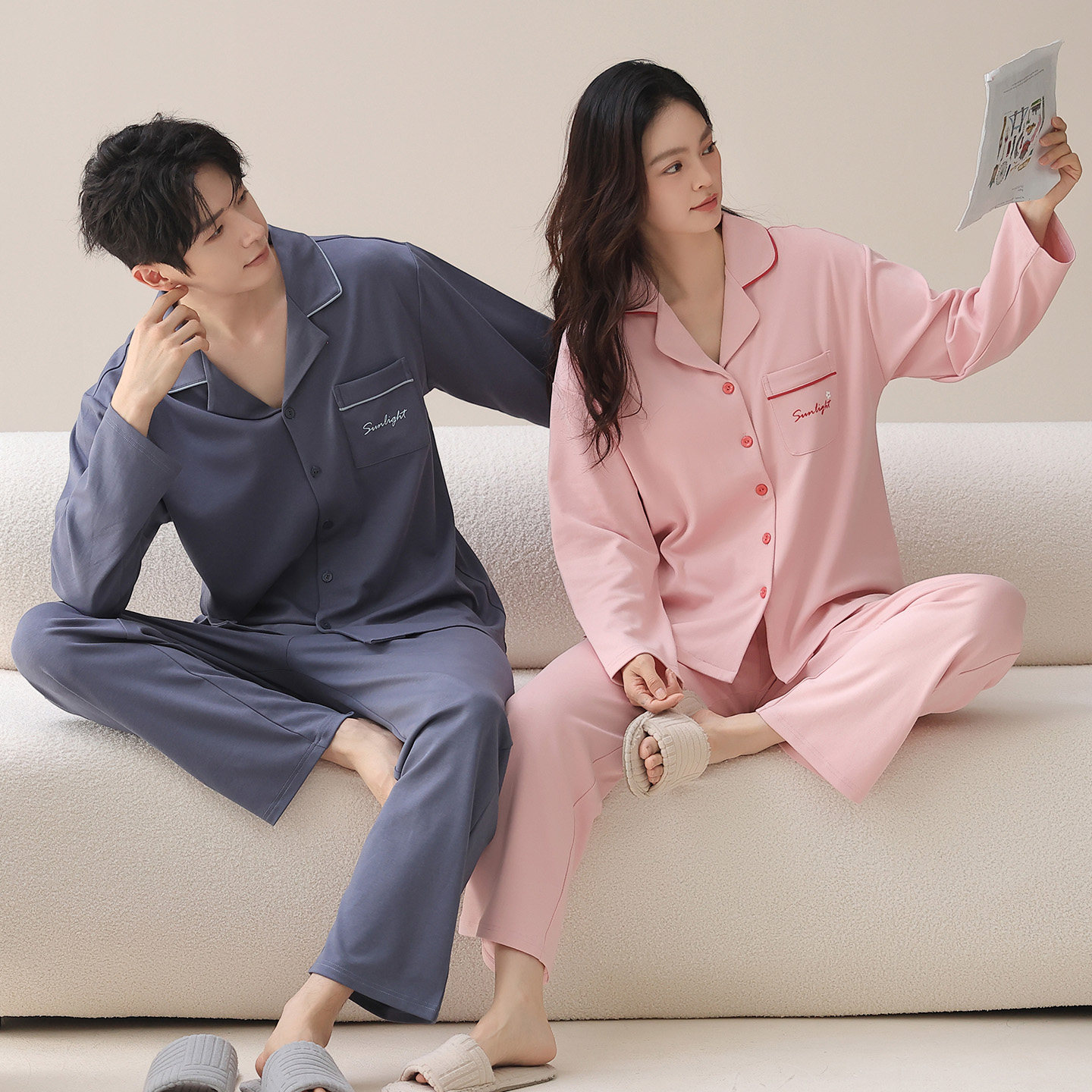都市丽人纯棉情侣睡衣男女春秋款长袖长裤全棉开衫家居服可外穿