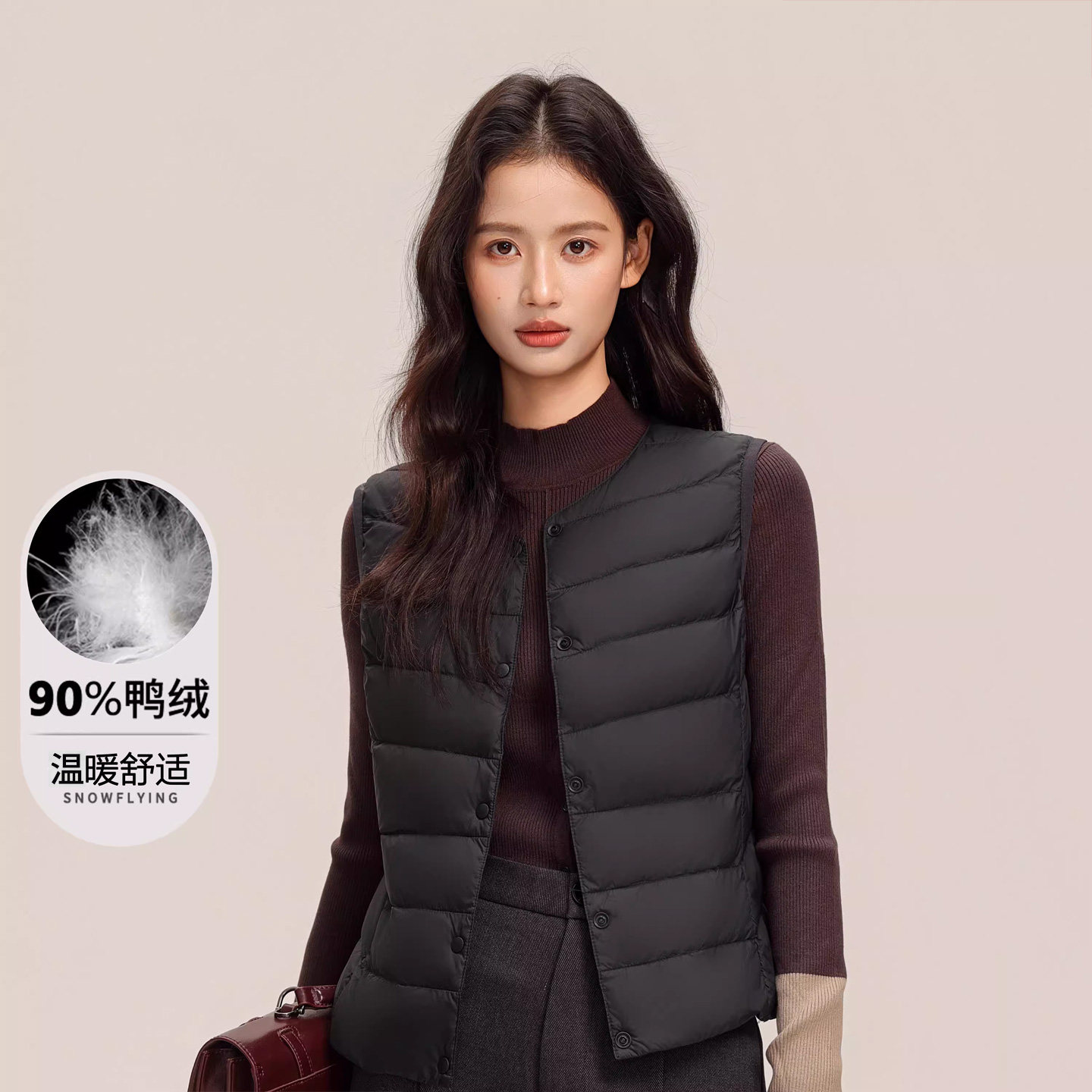 雪中飞26秋新款女士短款V领轻薄羽绒马甲背心纯色简约分格百搭W