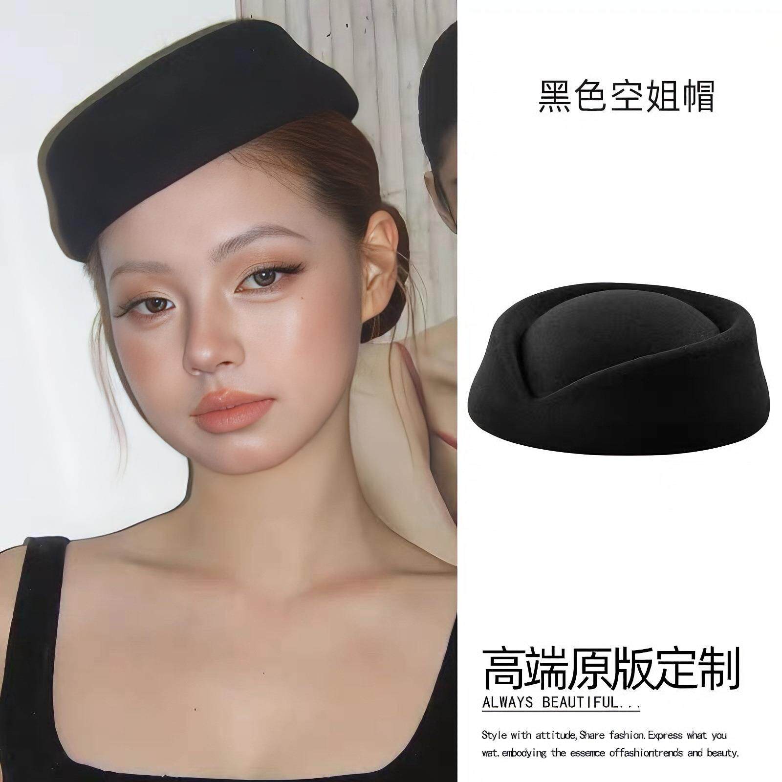 赫本风黑色贝雷帽子法式高级感小礼帽空姐制服千金帽复古帽子新品