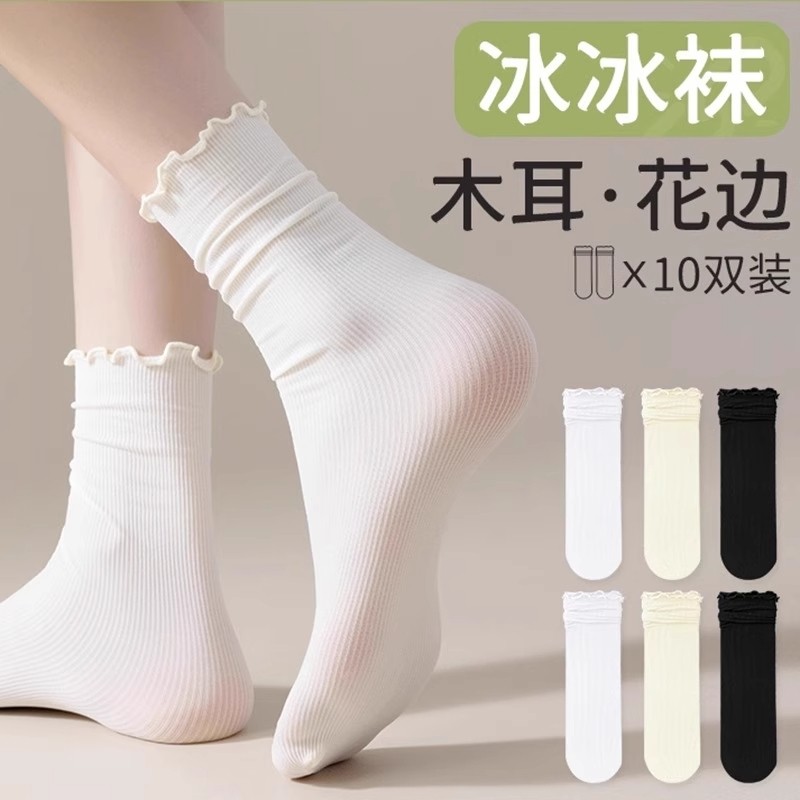 冰冰袜子女中筒袜夏季薄款木耳花边白色冰丝堆堆袜透气搭配小皮鞋