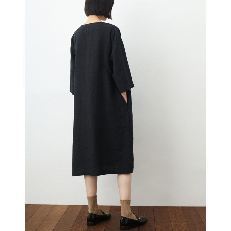汉麻花瓣边饰玉石禅意连衣裙小鱼春夏季新款黑色中长款宽松中式裙