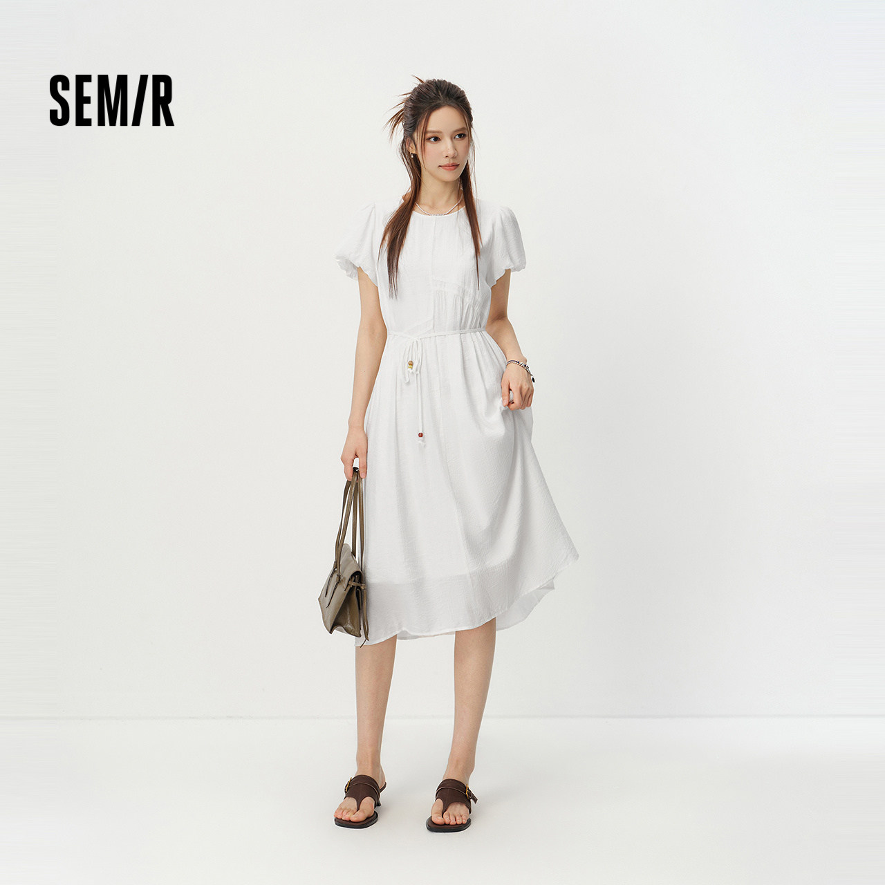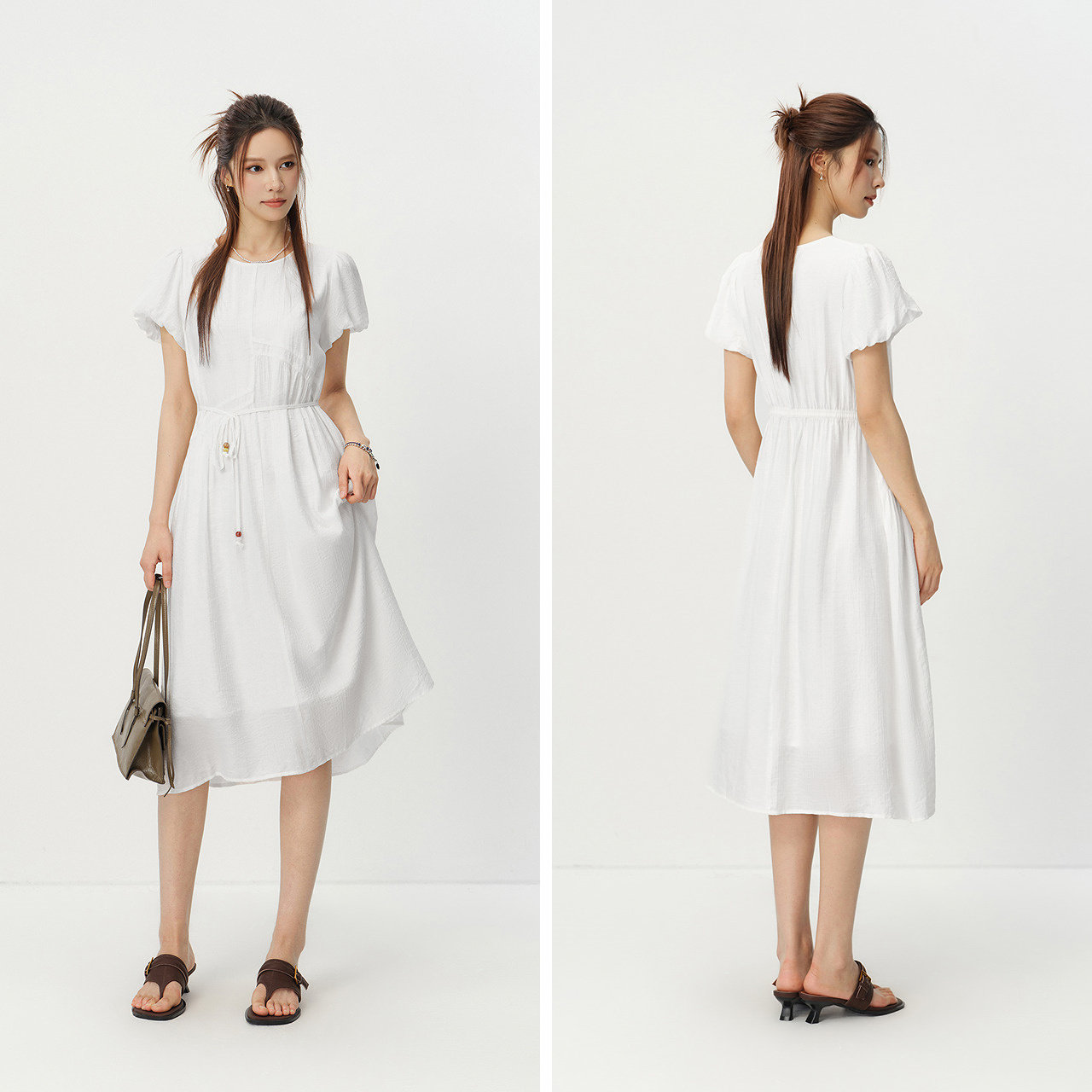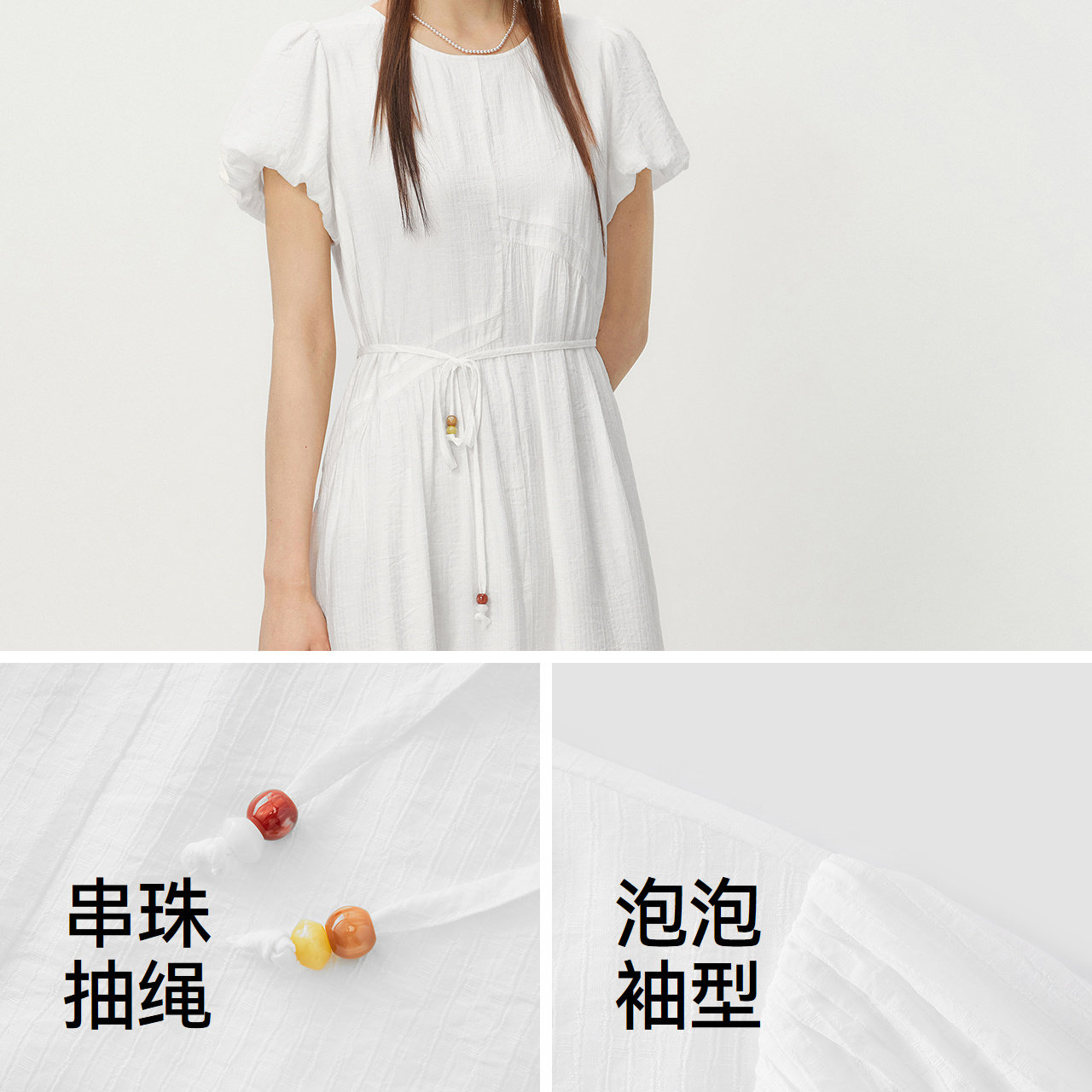 森马连衣裙女夏泡泡袖收腰肌理长裙2026新款优雅慵懒度假风小白裙