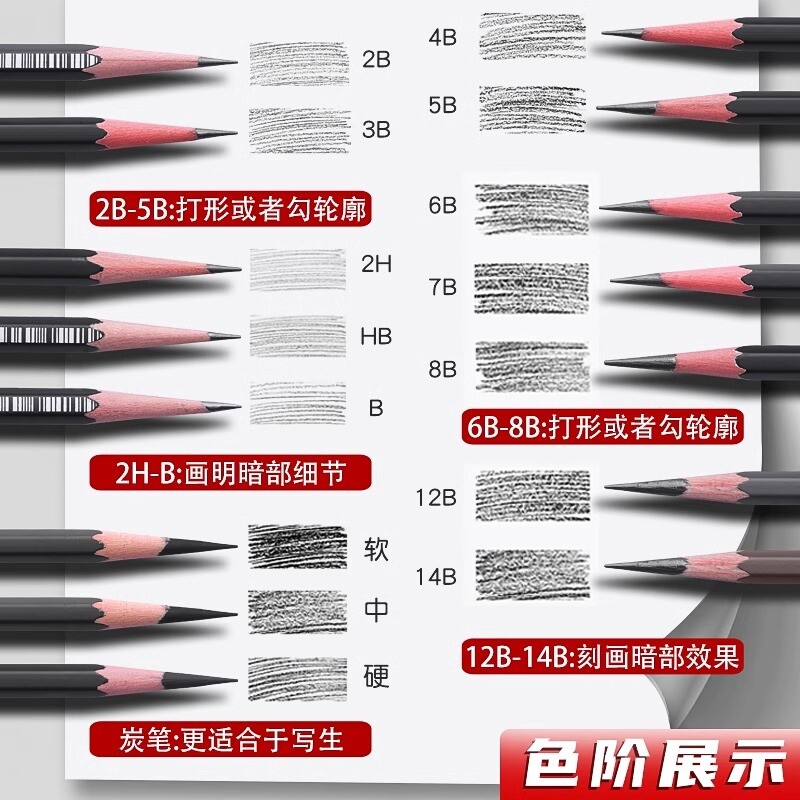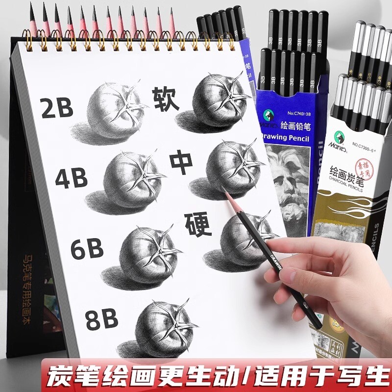 马利素描铅笔炭笔美术生专用14b2b3b4b5b6b7b8b12b碳笔套装软中硬软软碳绘画工具笔16B哑光专业初学特软速写