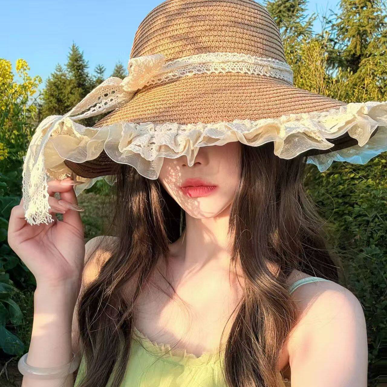 蕾丝花边大帽檐草帽女夏季甜美百搭海边度假沙滩帽法式遮阳防晒帽