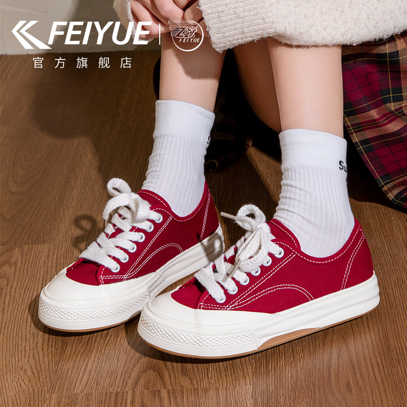 feiyue/飞跃红色帆布鞋女鞋2026春季新款马年保暖休闲加厚板鞋子