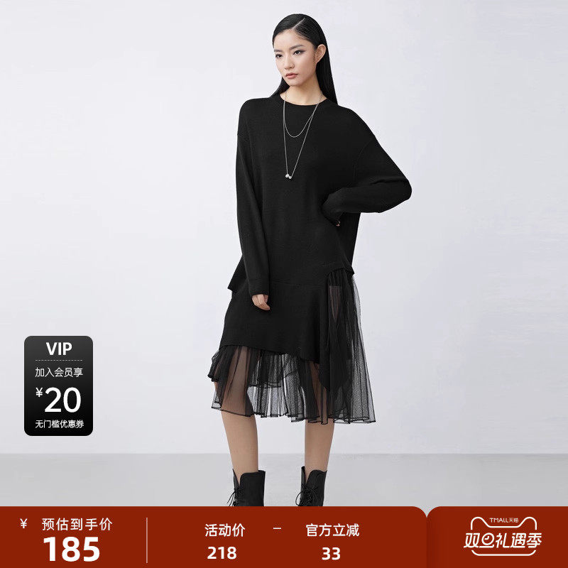 S·DEER圣迪奥女装罗纹圆领网纱拼接不规则针织连衣裙S21481214