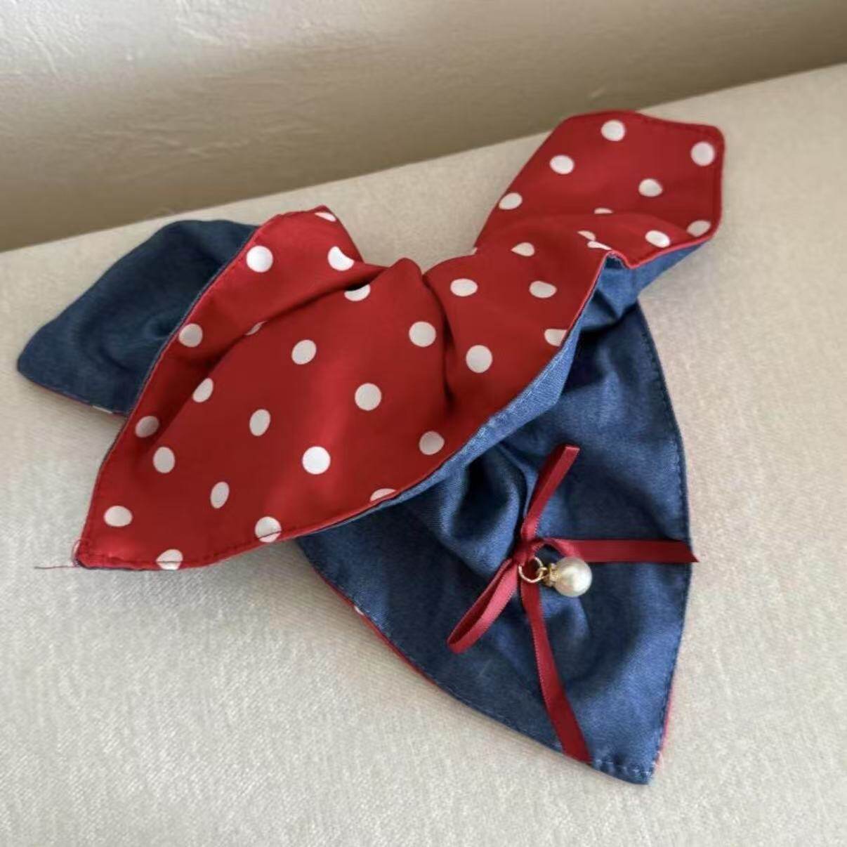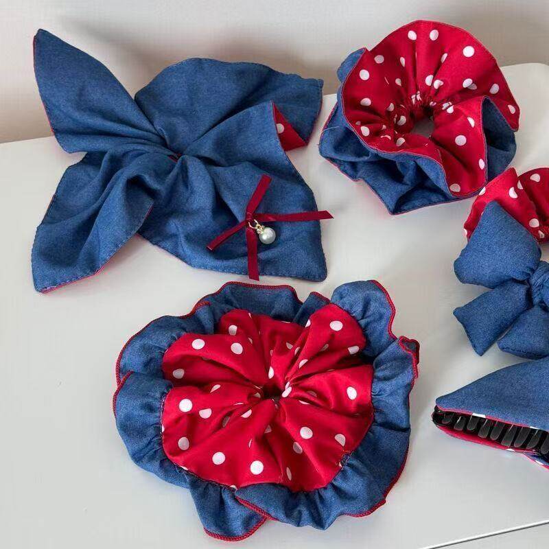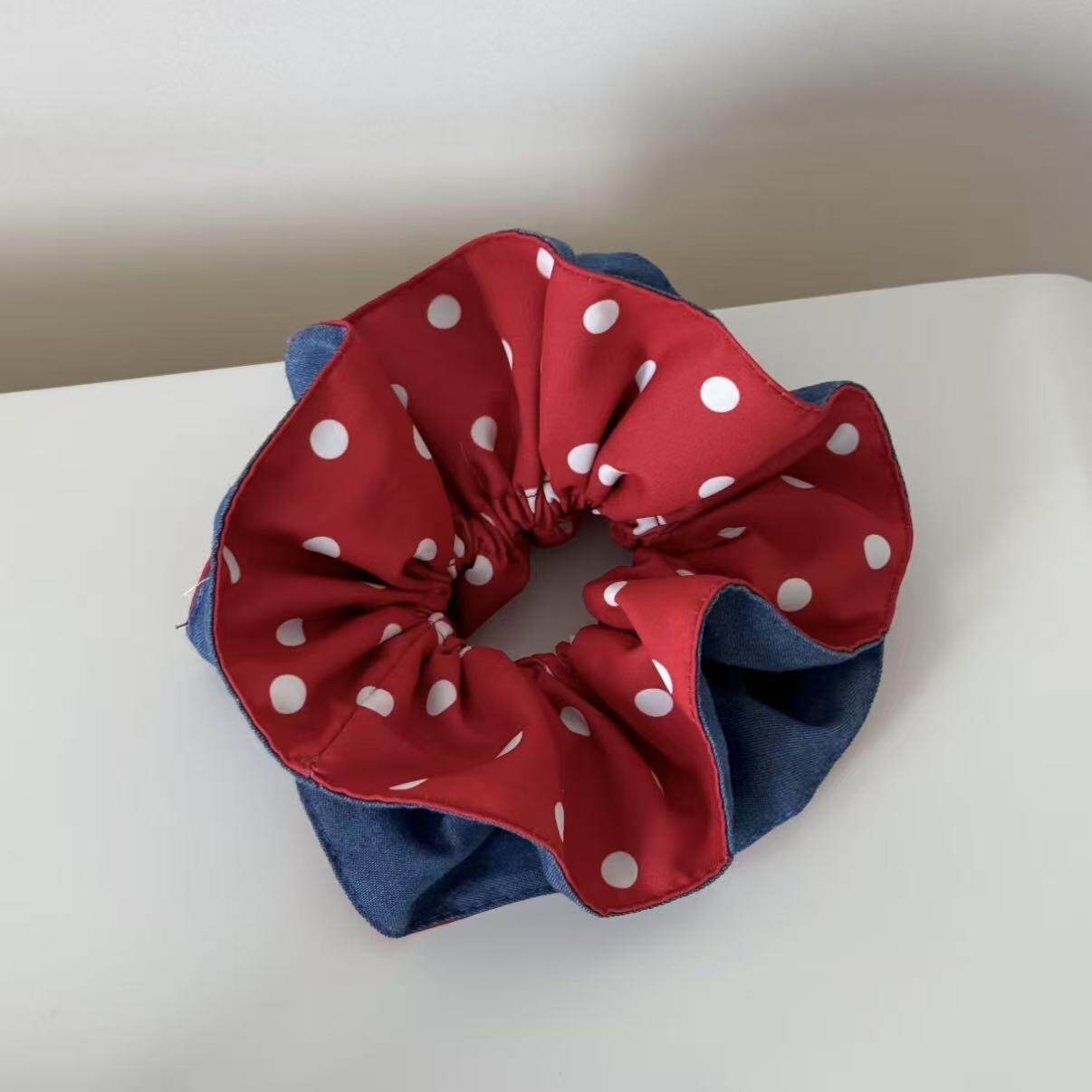 牛仔红波点拼接大肠方巾发圈高颜值气质高级感简约百搭小众盘发圈