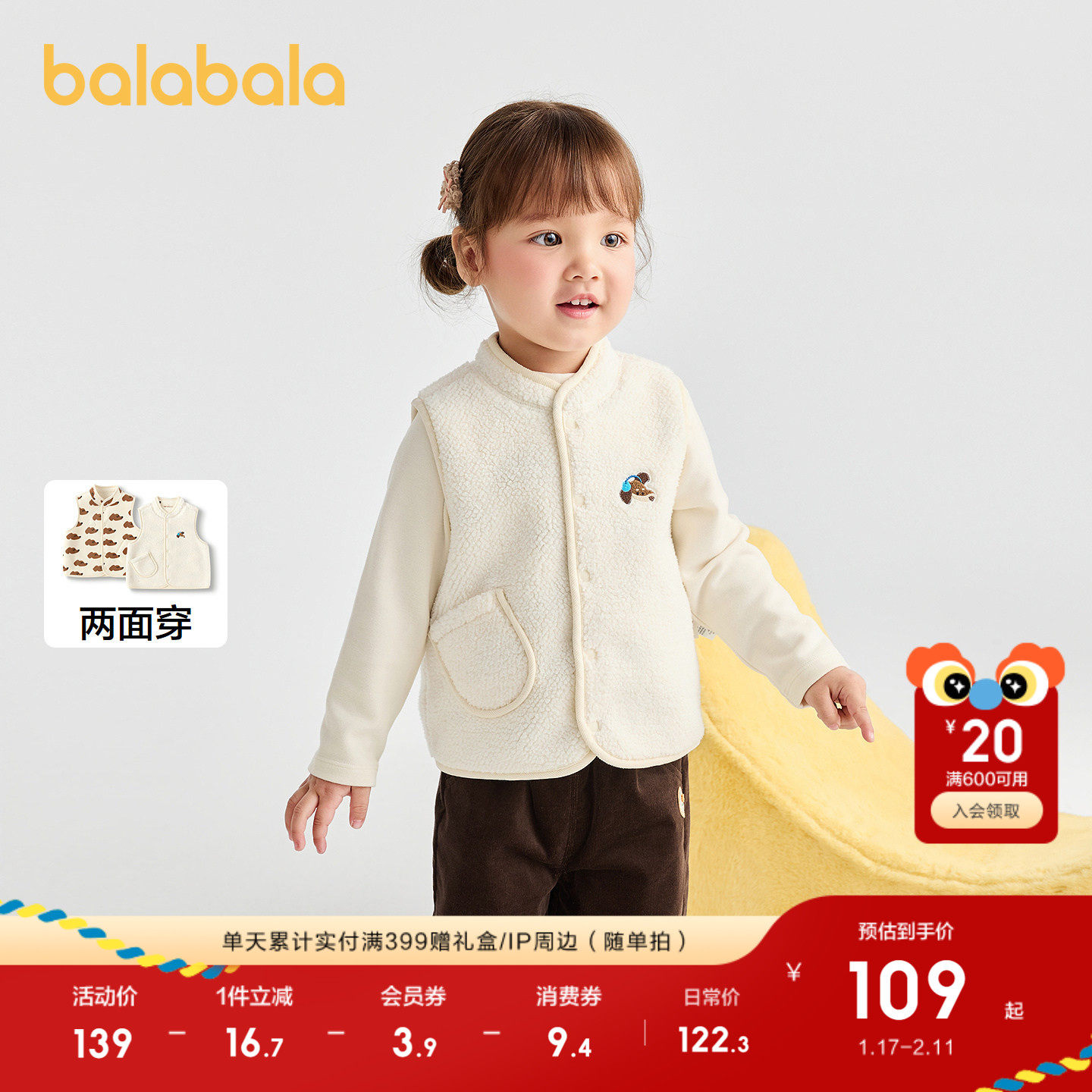 巴拉巴拉童装宝宝马甲双面穿仿羊羔绒外套秋冬2025新款潮时尚潮酷