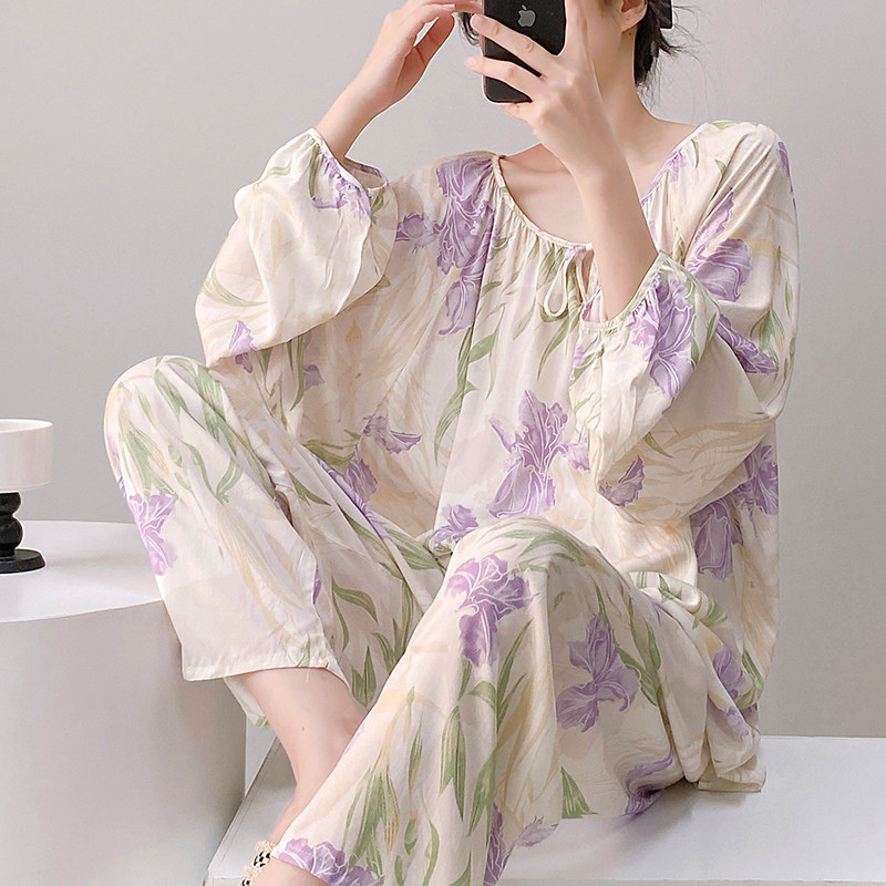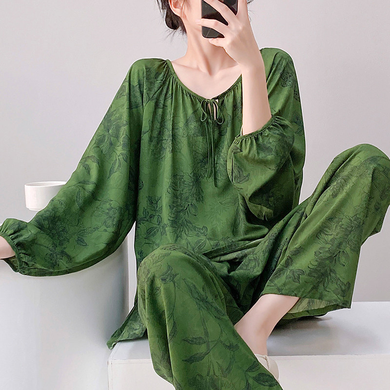 棉绸睡衣女士春秋夏长袖长裤绵绸家居服人造棉套装大码宽松薄长款
