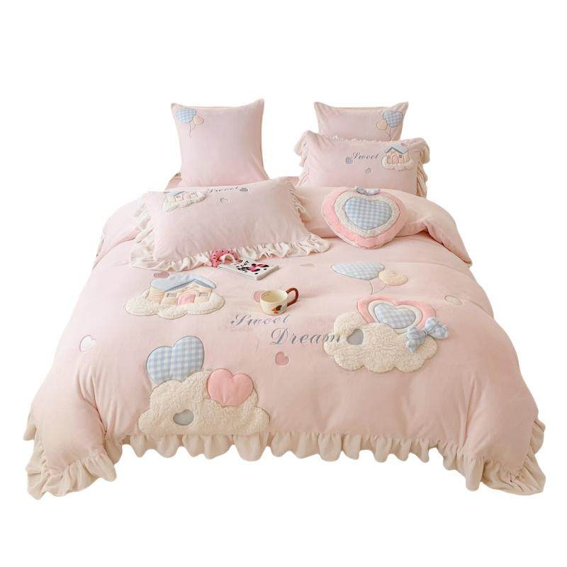 冬季可爱少女心保暖牛奶绒四件套立体蝴蝶结刺绣加厚被套女孩床品