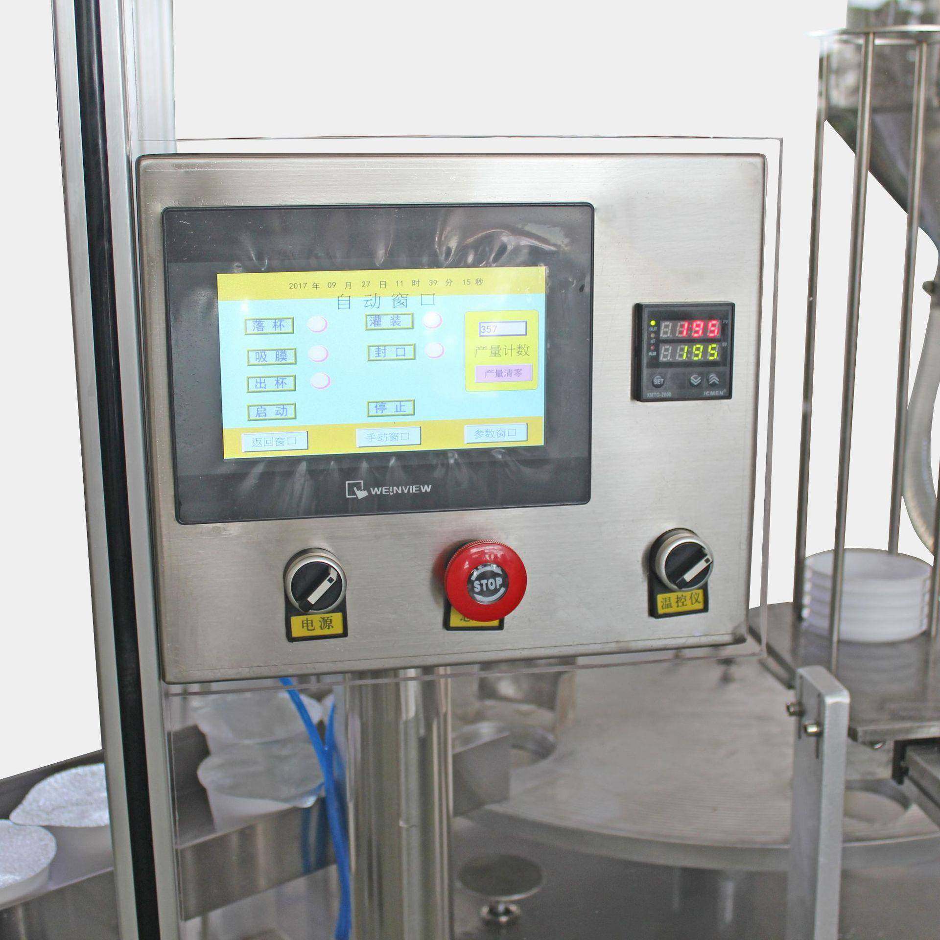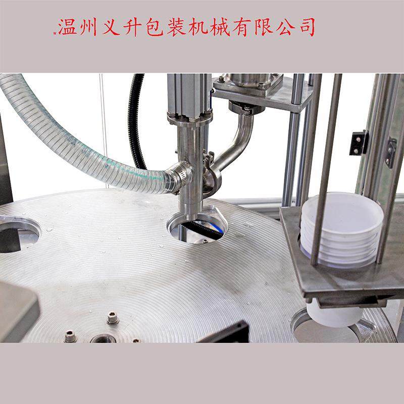 厂家直供圆盘一出一不锈钢酸奶液体全自动灌装封口机,带防护罩