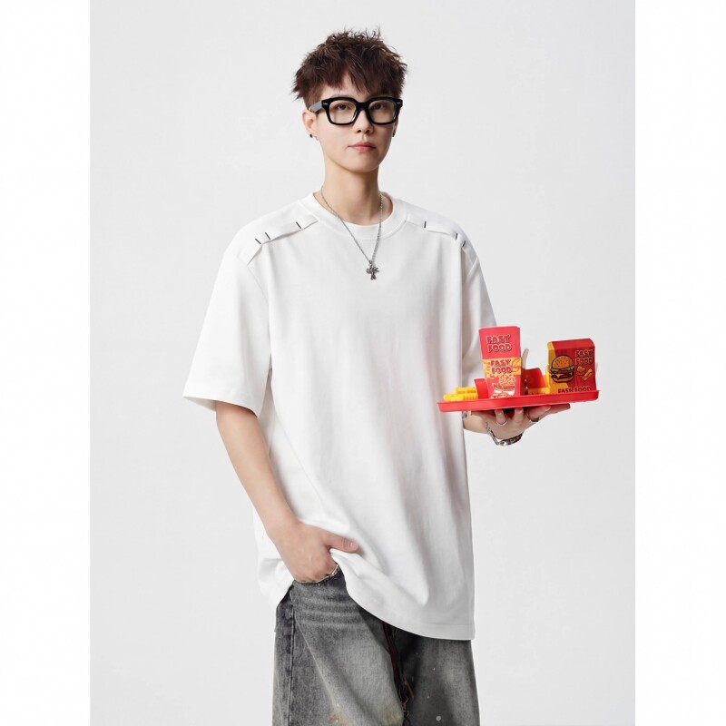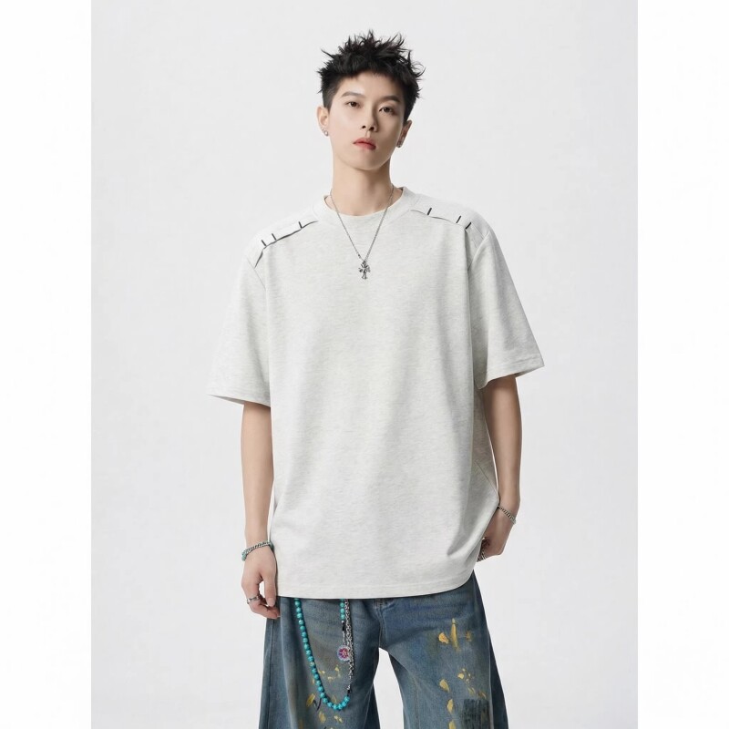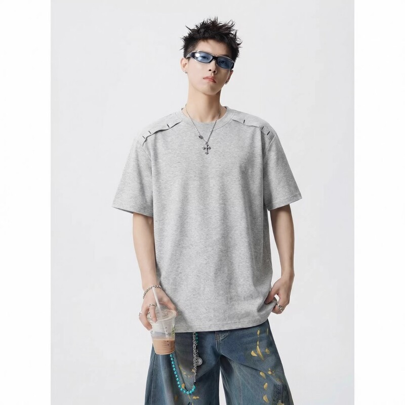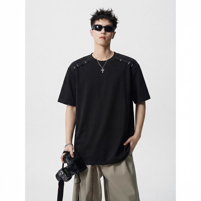 美式潮牌正肩T恤短袖男夏季宽松薄款半袖上衣男生黑色设计感体恤