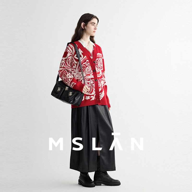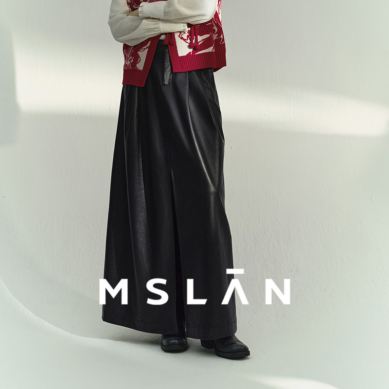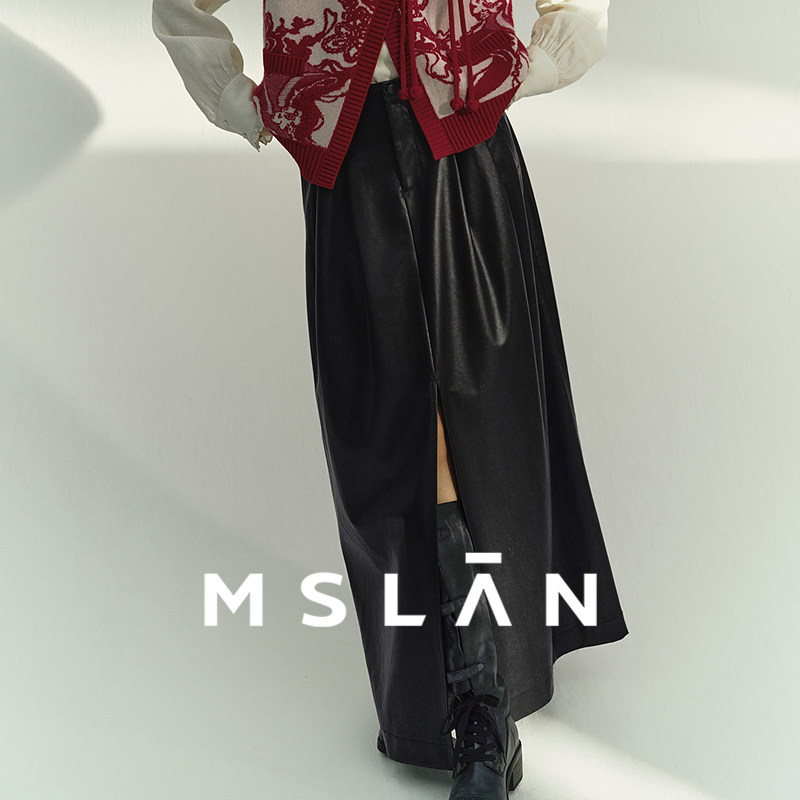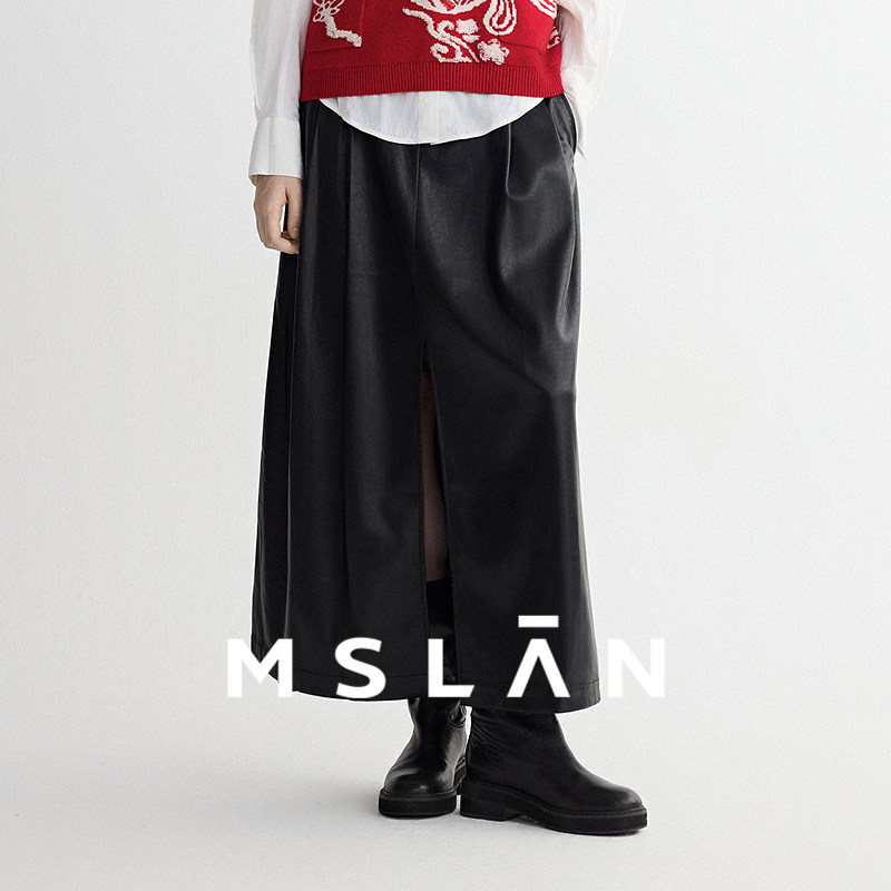 「摩登时代」MSLAN复古双褶开叉A字显瘦半身裙直筒PU皮裙