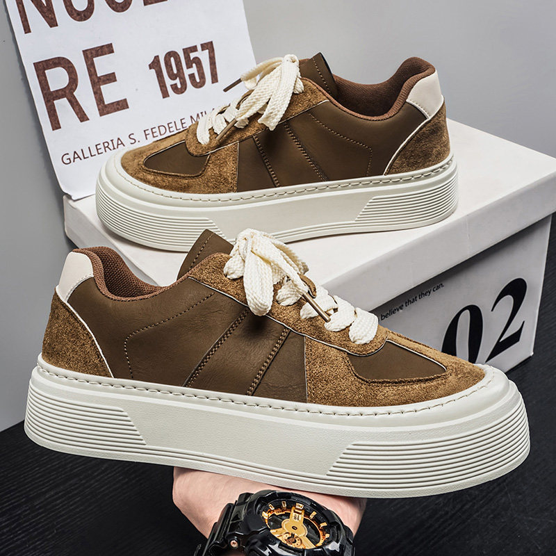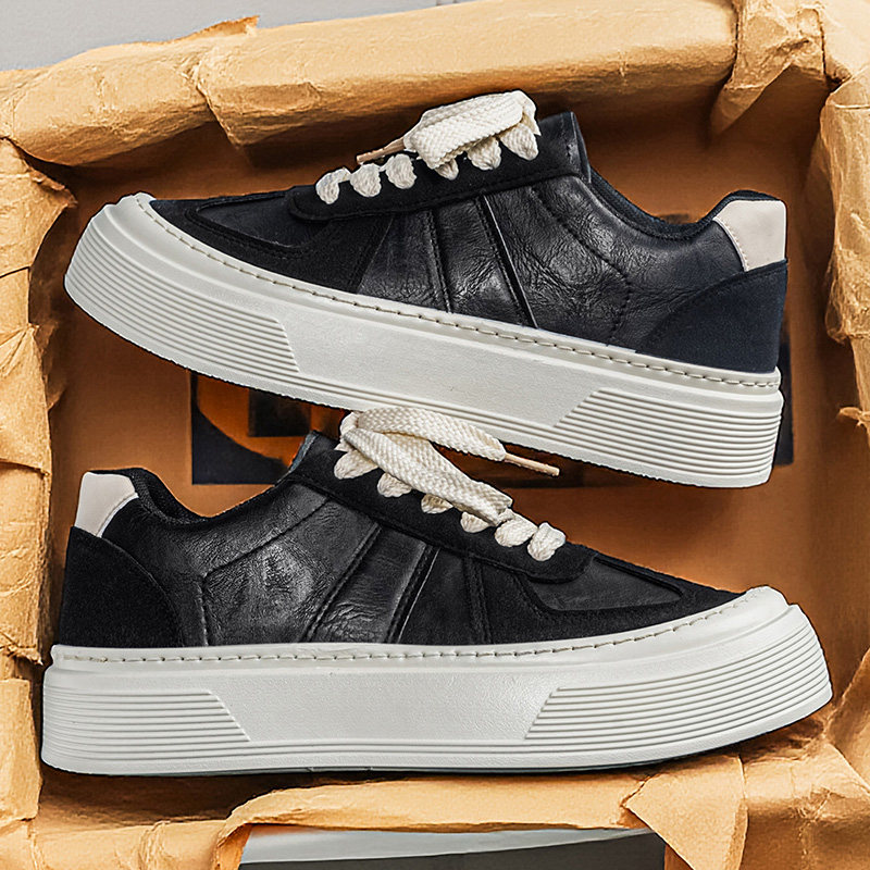 皮面德训鞋男2026新款春季厚底板鞋男款增高松糕休闲鞋子黑色圆头