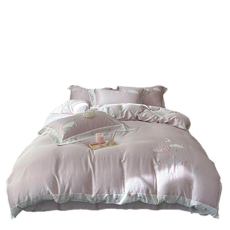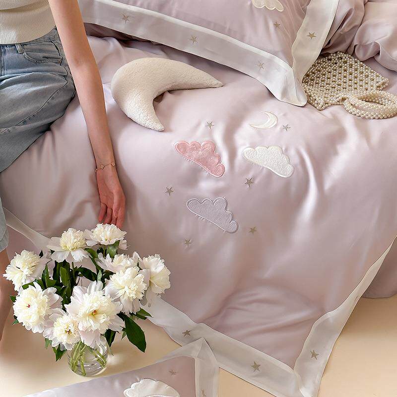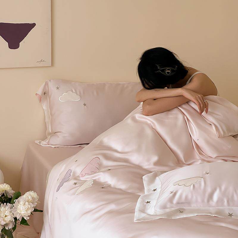 小清新云朵刺绣100S兰精天丝夏季裸睡床品粉色少女心被套床单套件