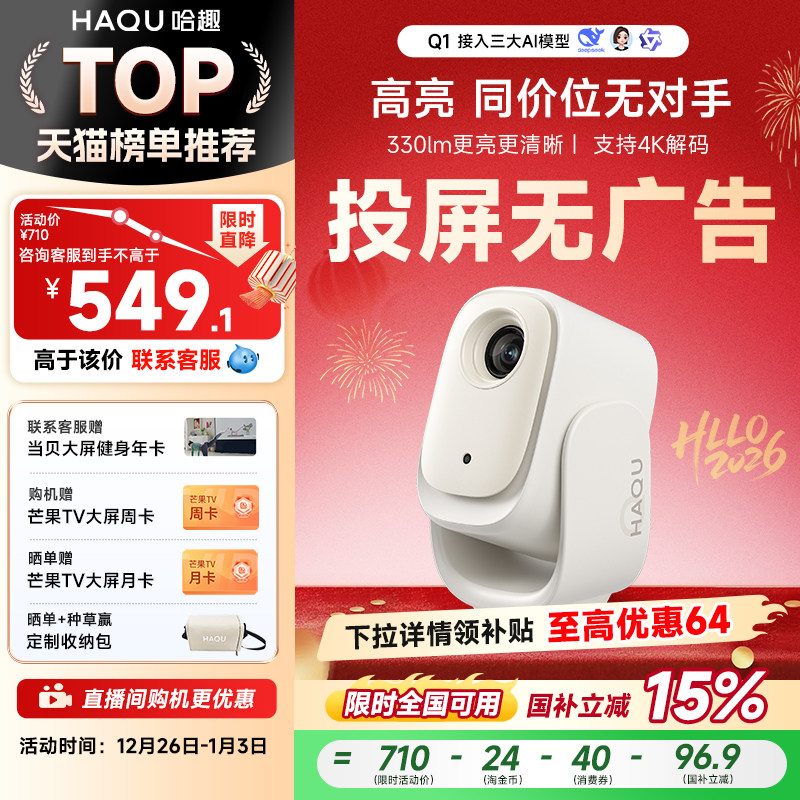【政府补贴15%】哈趣Q1投影仪小型宿舍学生 家用超高清云台一体真1080P智能护眼卧室可投屏便携投影机4K解码