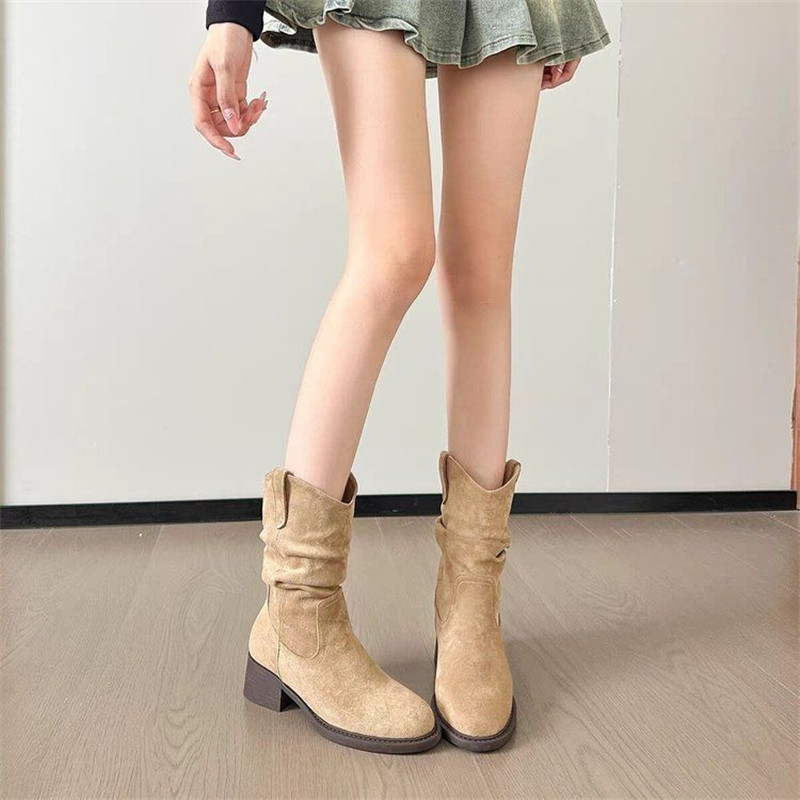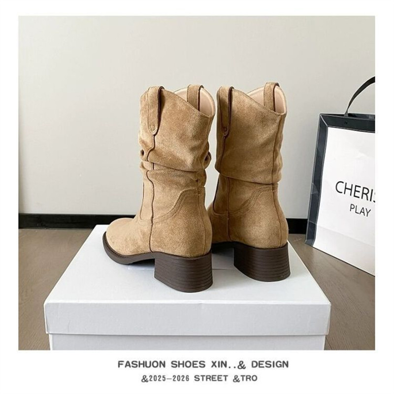 短靴子女中筒堆堆靴子女夏2025新款秋季美西部牛仔马丁靴尖头绒面