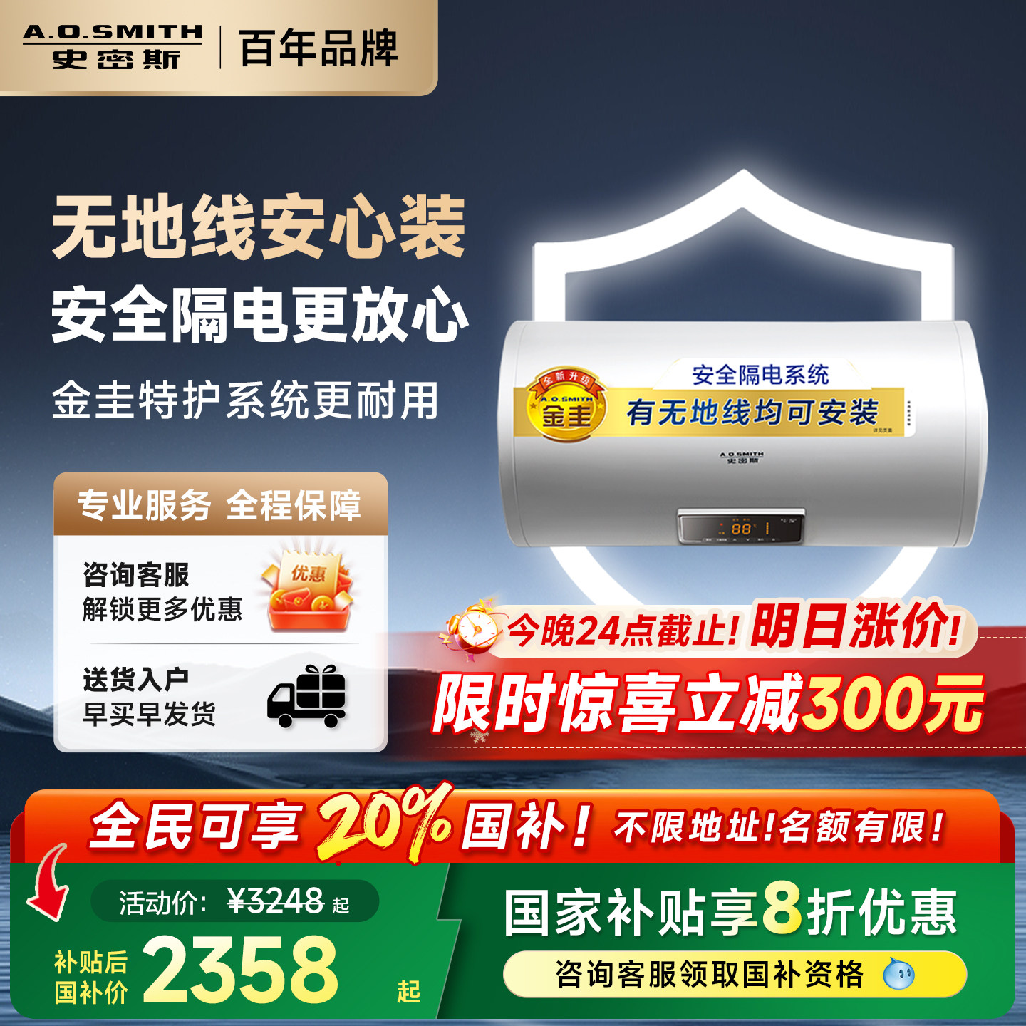 [国补20%]AO史密斯金圭无地线安全电热水器50/60/80升VDS村镇入户