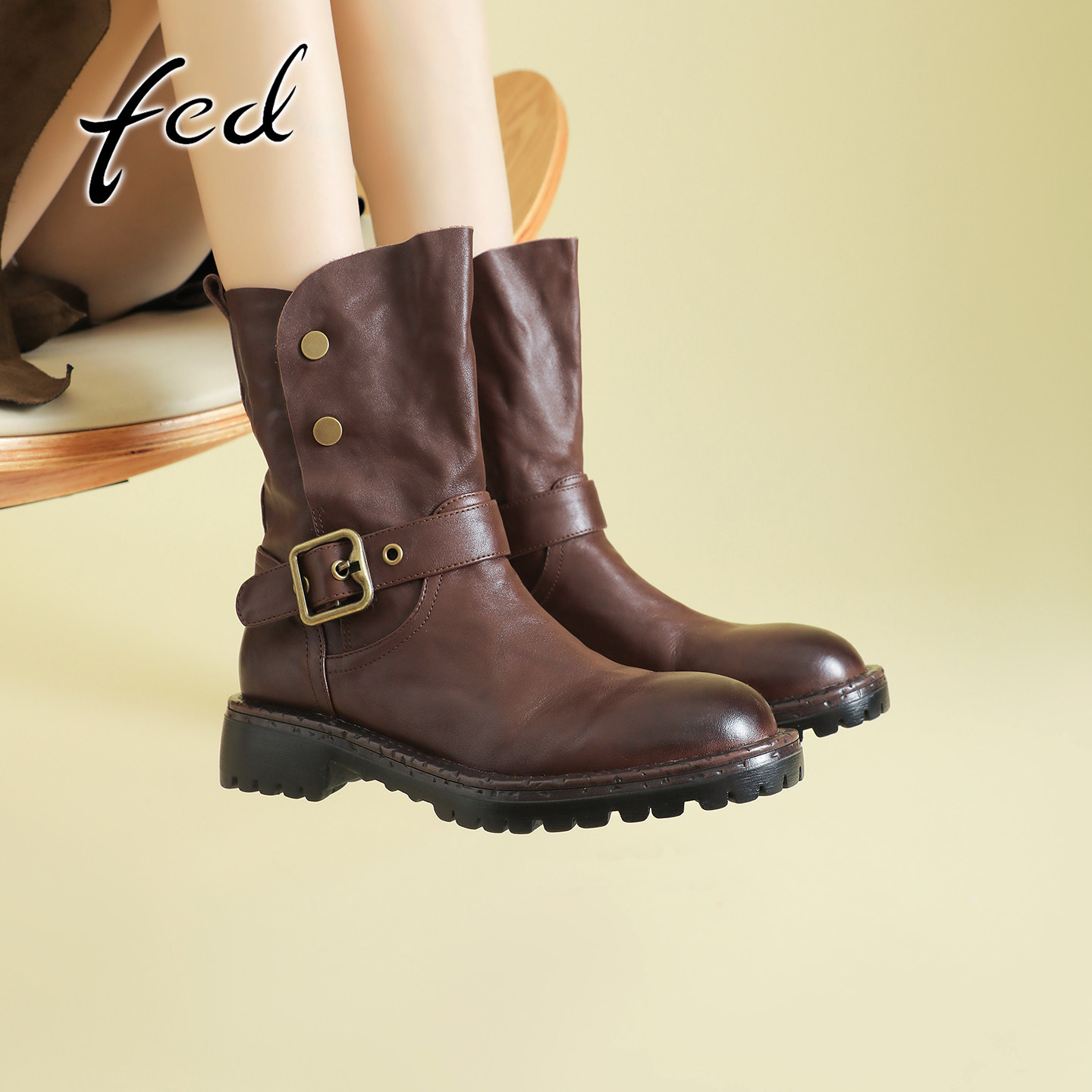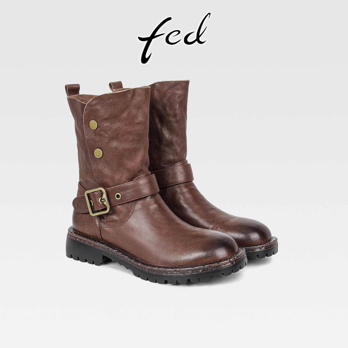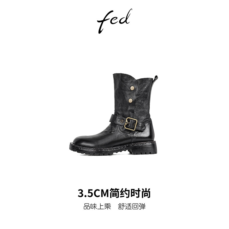 fed英伦风真皮粗跟皮带扣马丁靴女秋冬新款中跟圆头复古机车短靴