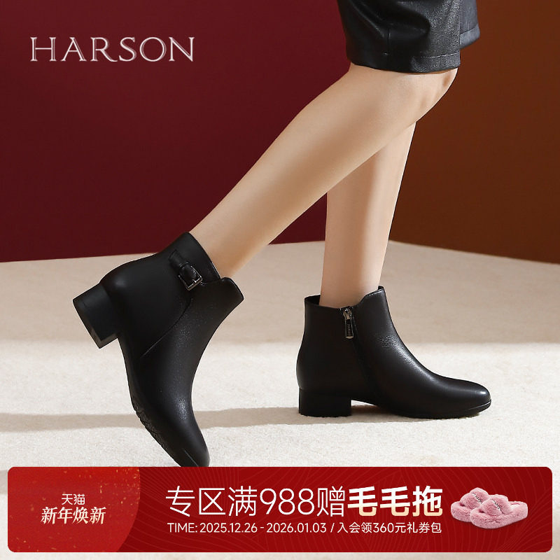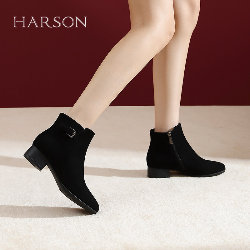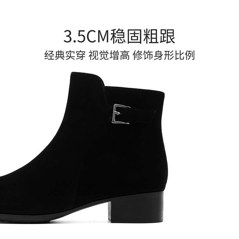 哈森气质粗中跟侧拉链百搭舒适加绒女短靴2025冬季新品HA257916