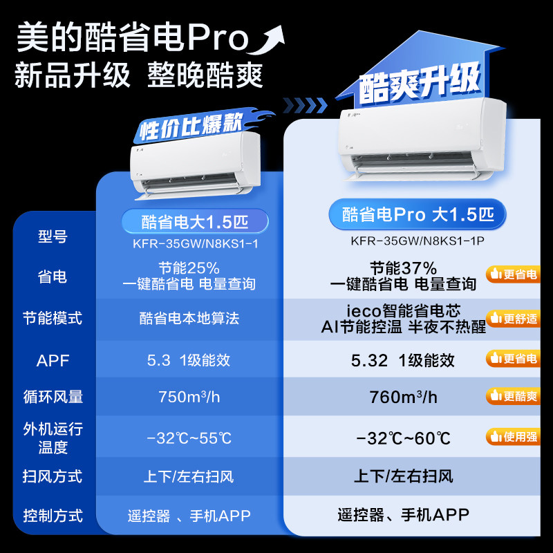 美的酷省电Pro空调家用一级卧室1.5匹2匹官方变频冷暖正品大挂机