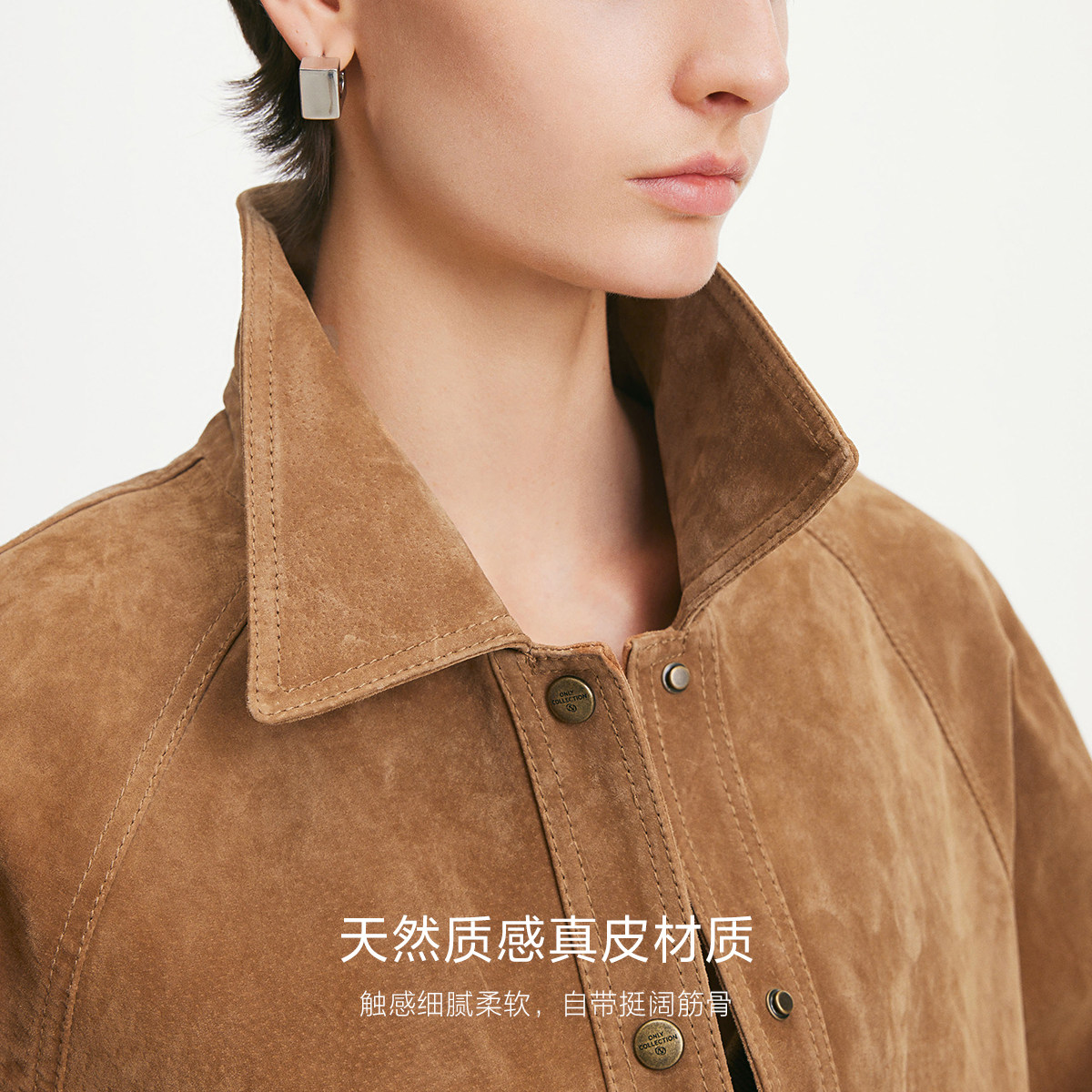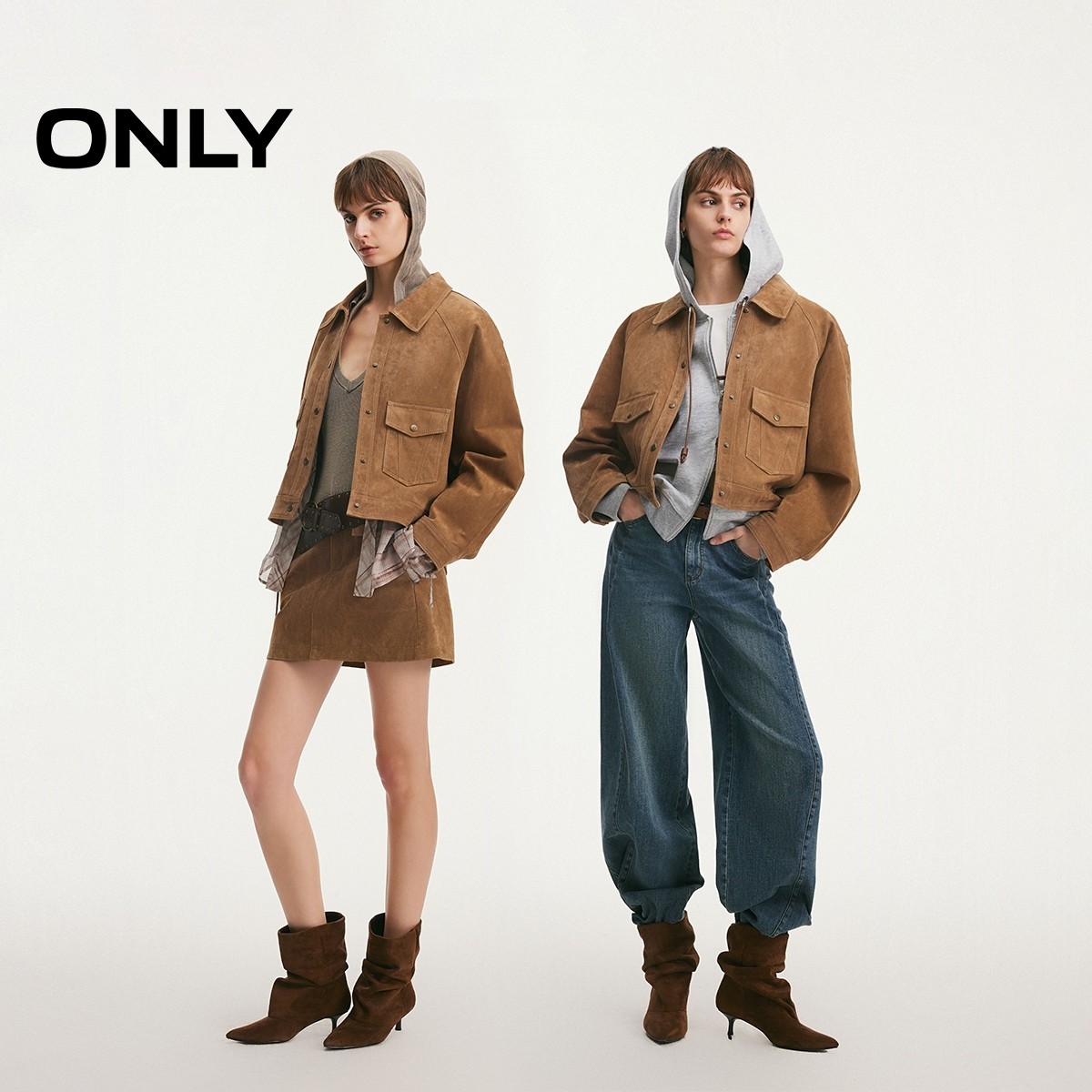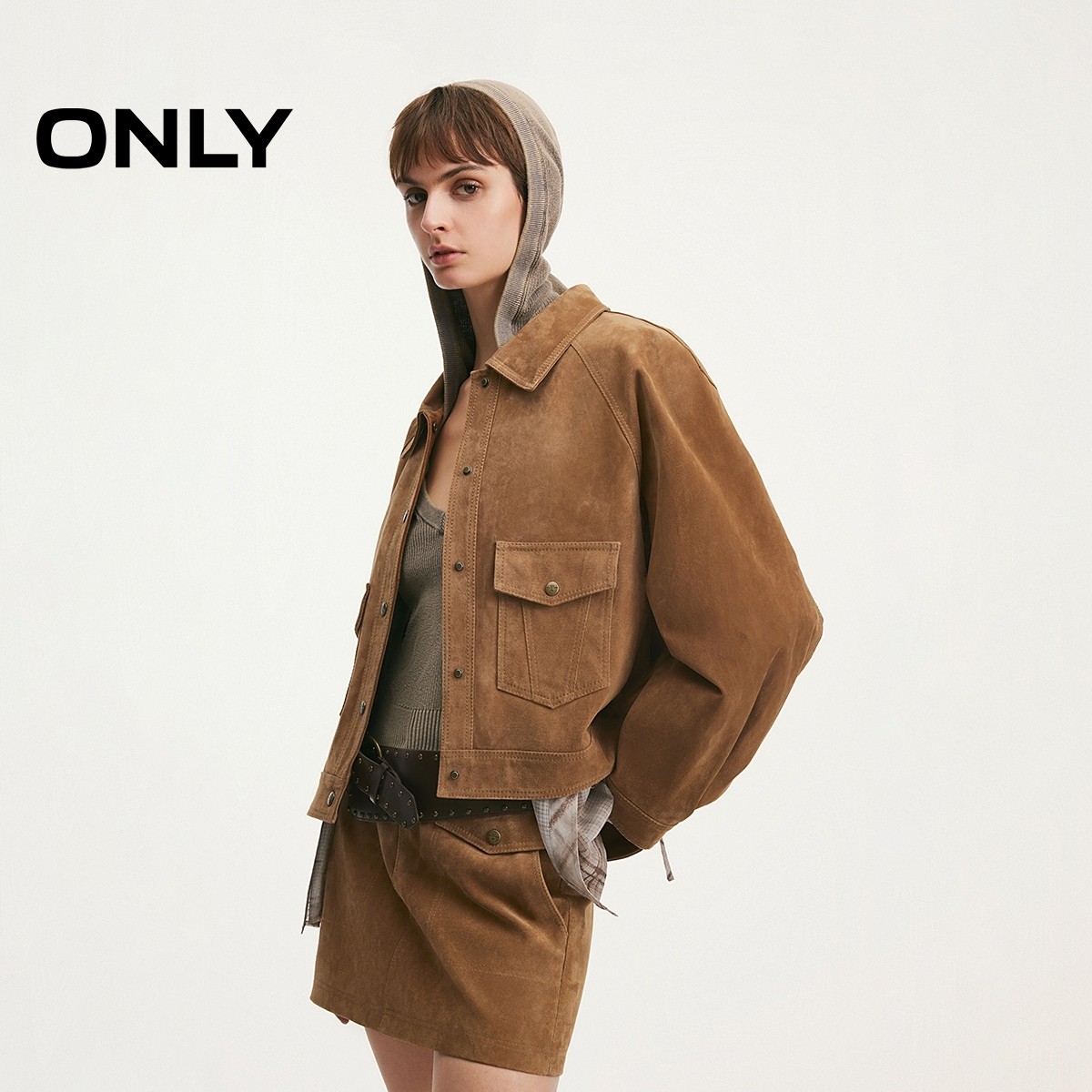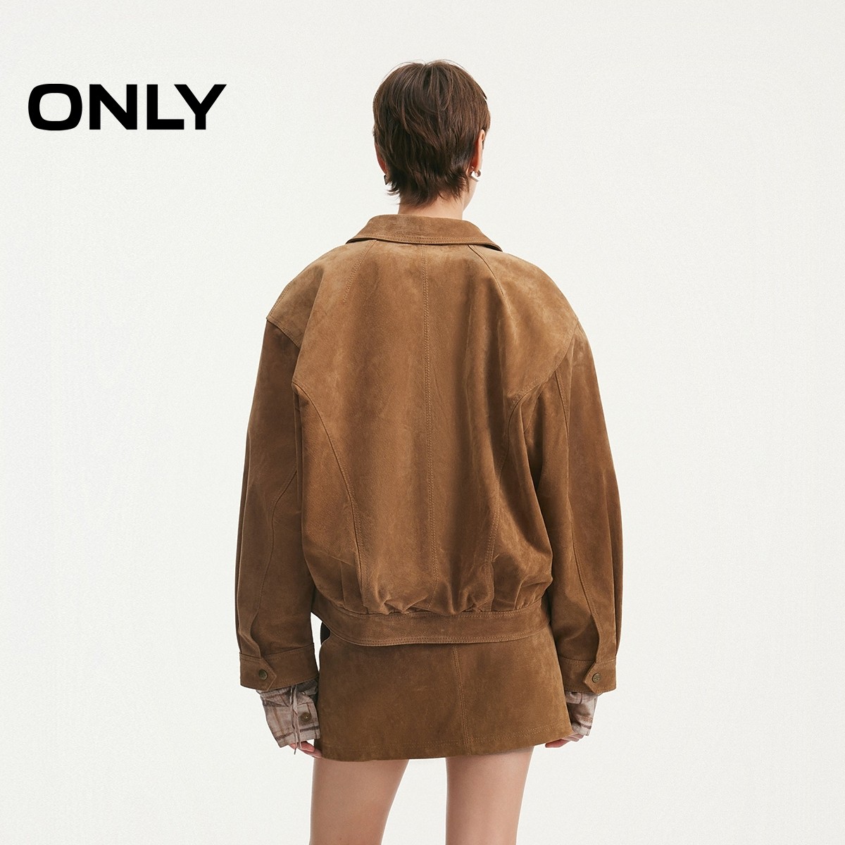 ONLY2026春季新款猪皮后背显瘦解构剪裁挺阔插肩宽松真皮皮衣女