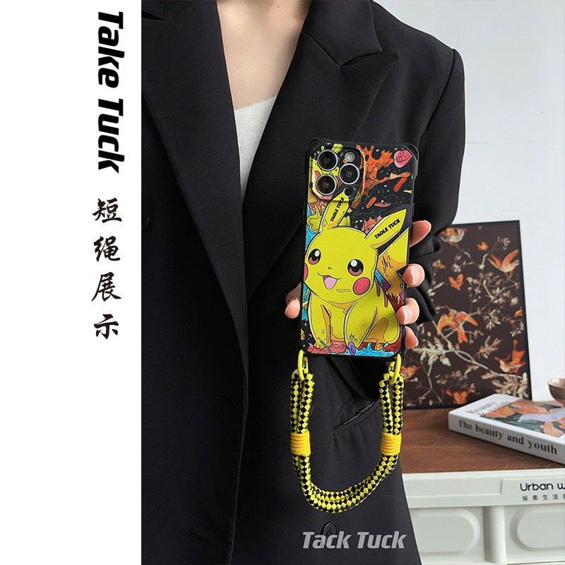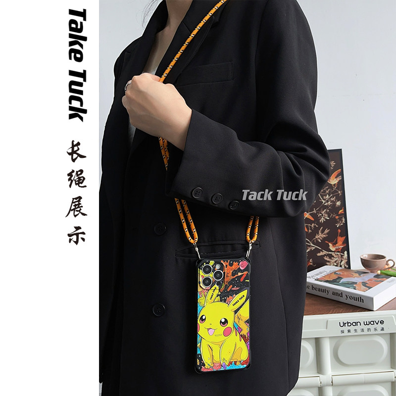 彩绘卡通皮卡丘挂绳手机壳适用华为mate60Pro全包13防摔软硅胶16promax斜挎黑色四角开孔小米14苹果15promax