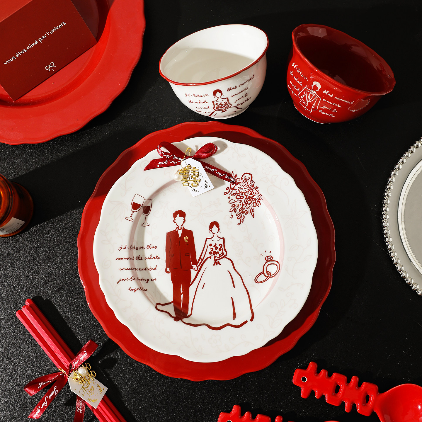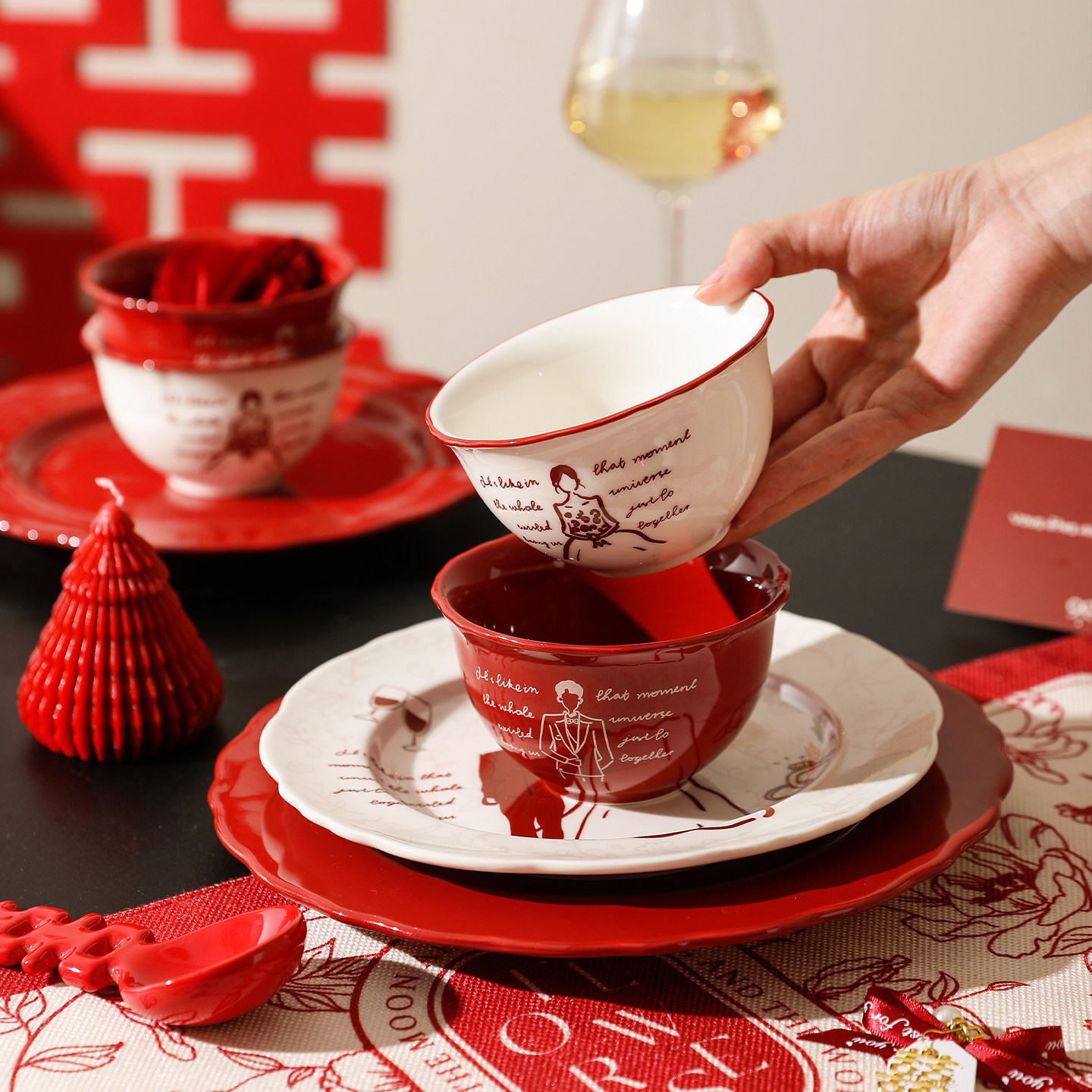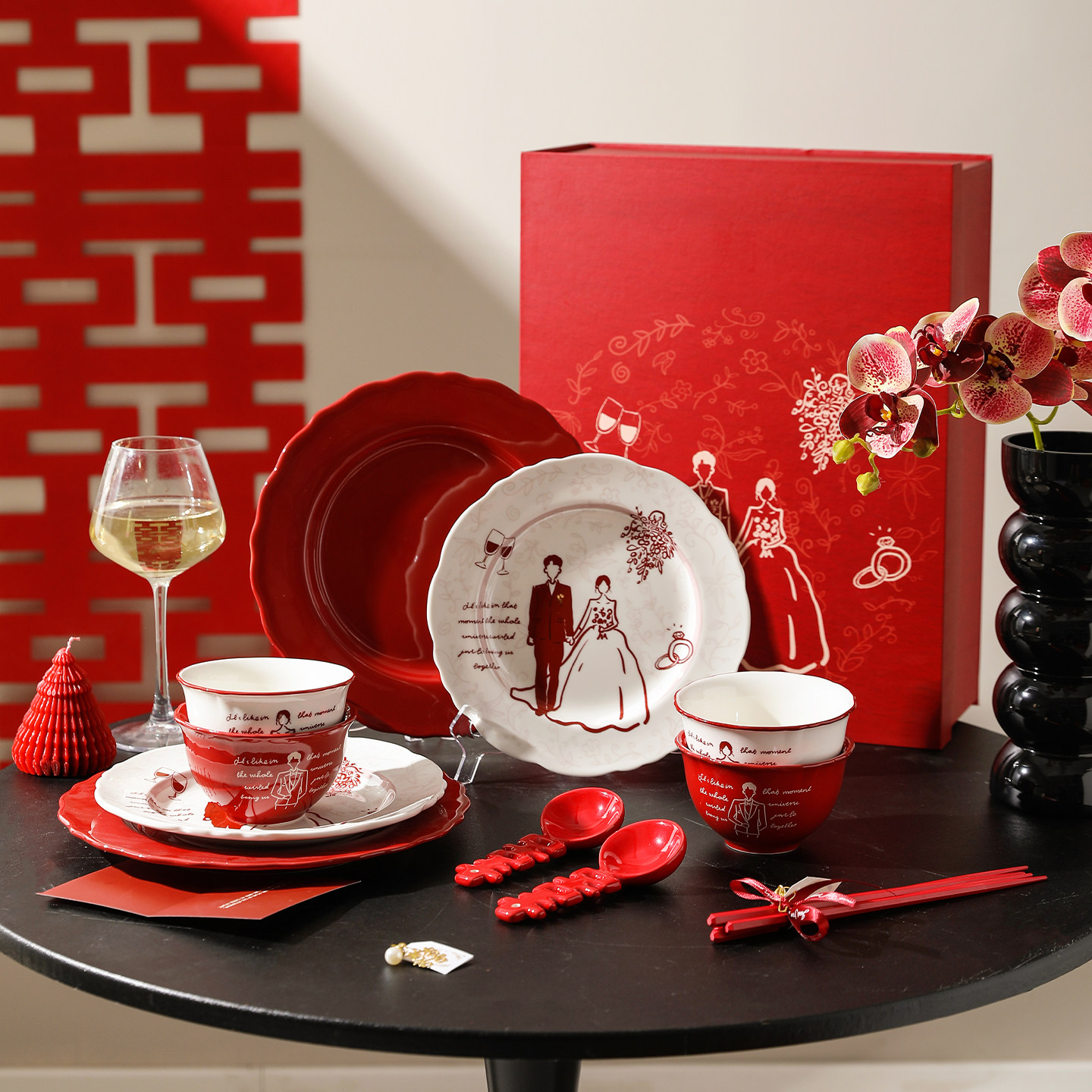 高档碗碟餐具陶瓷新婚礼物送新娘红色碗盘筷套装乔迁新居结婚礼盒